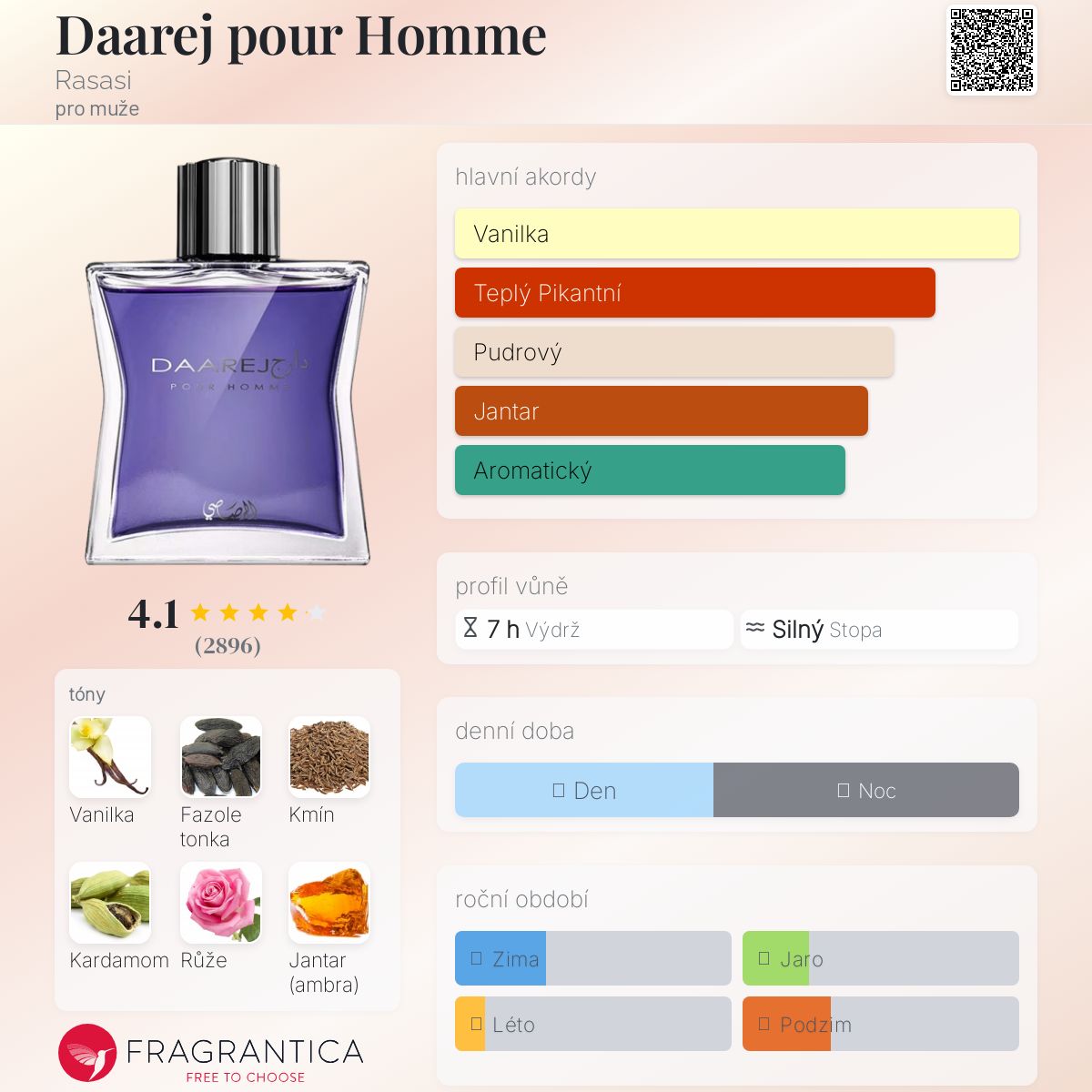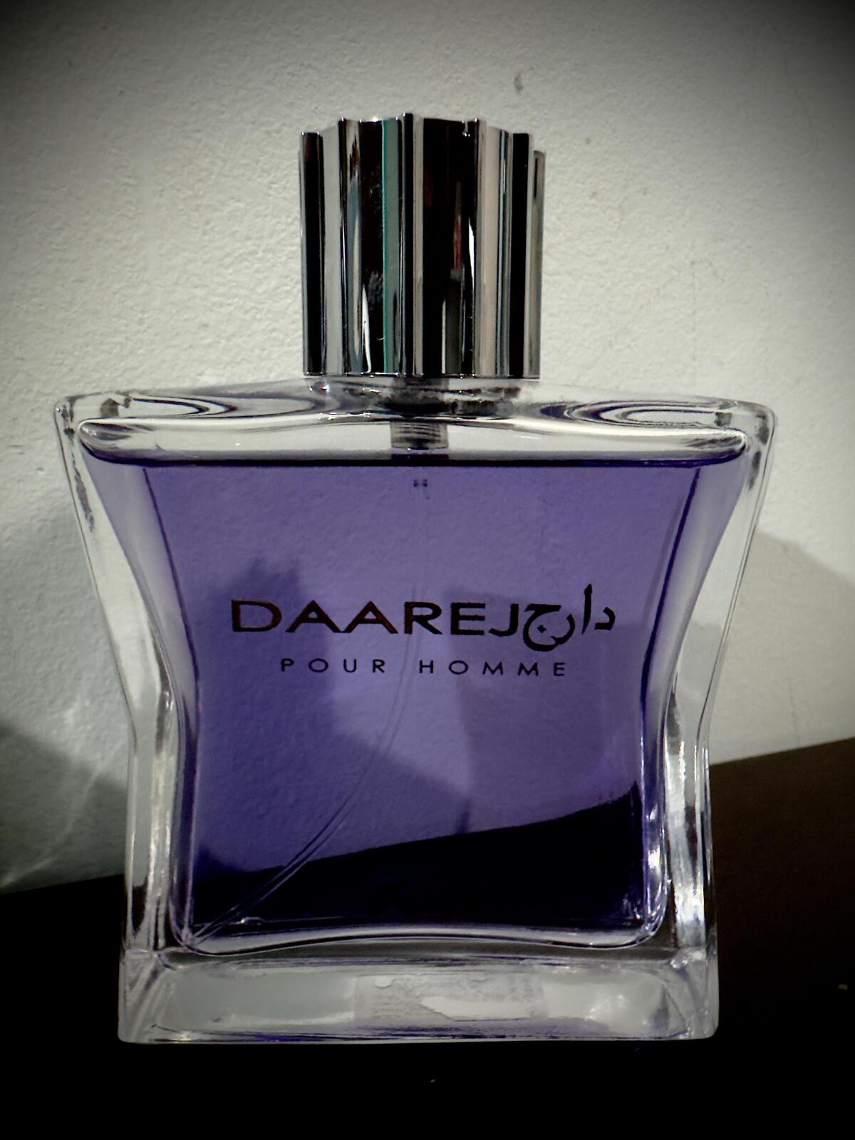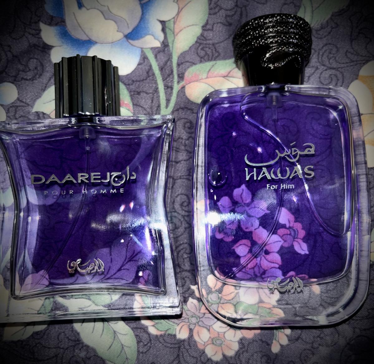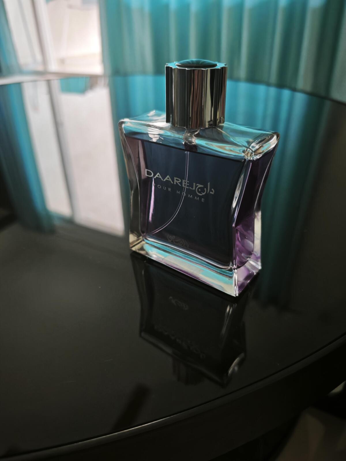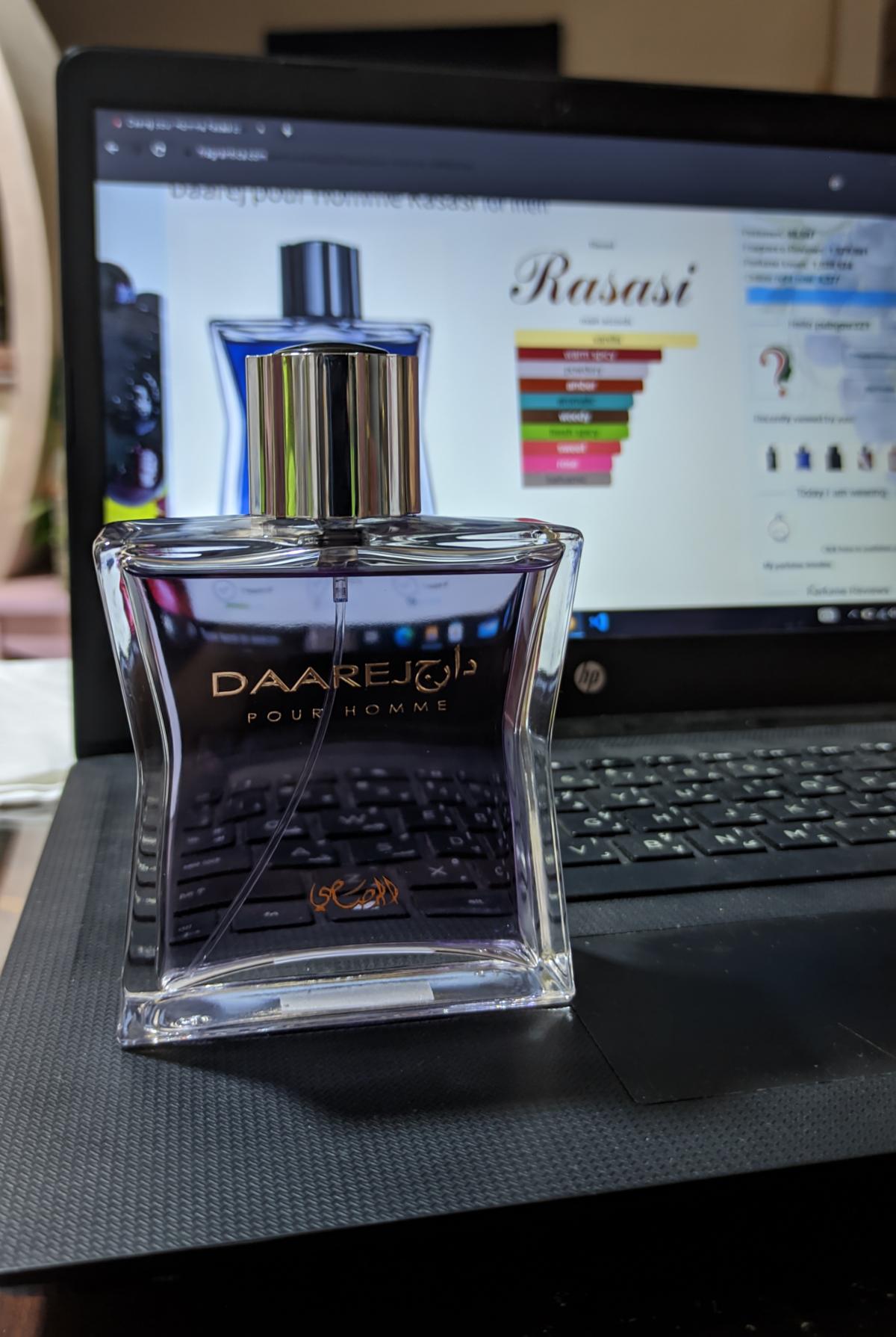 Daarej pour Homme podle Rasasi je Orientální Spicy vůně pro muže. Vrchní tóny jsou Kmín, Kardamom a Pelyněk; střední tóny jsouRůže a Kořen orris ; základní tóny jsou Vanilka, Fazole tonka, Jantar (ambra), Santalové dřevo, Pačuli a Pižmo.