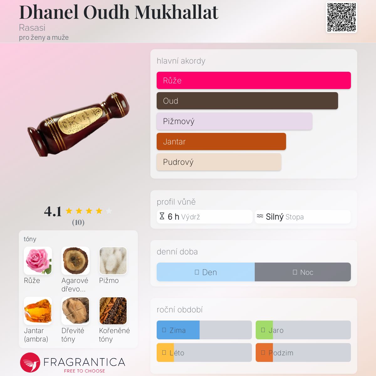 Dhanel Oudh Mukhallat podle Rasasi je Orientální vůně pro ženy a muže. Vrchní tóny jsou Růže a Agarové dřevo (oud); střední tóny jsouPižmo a Dřevité tóny ; základní tóny jsou Jantar (ambra) a Koření.