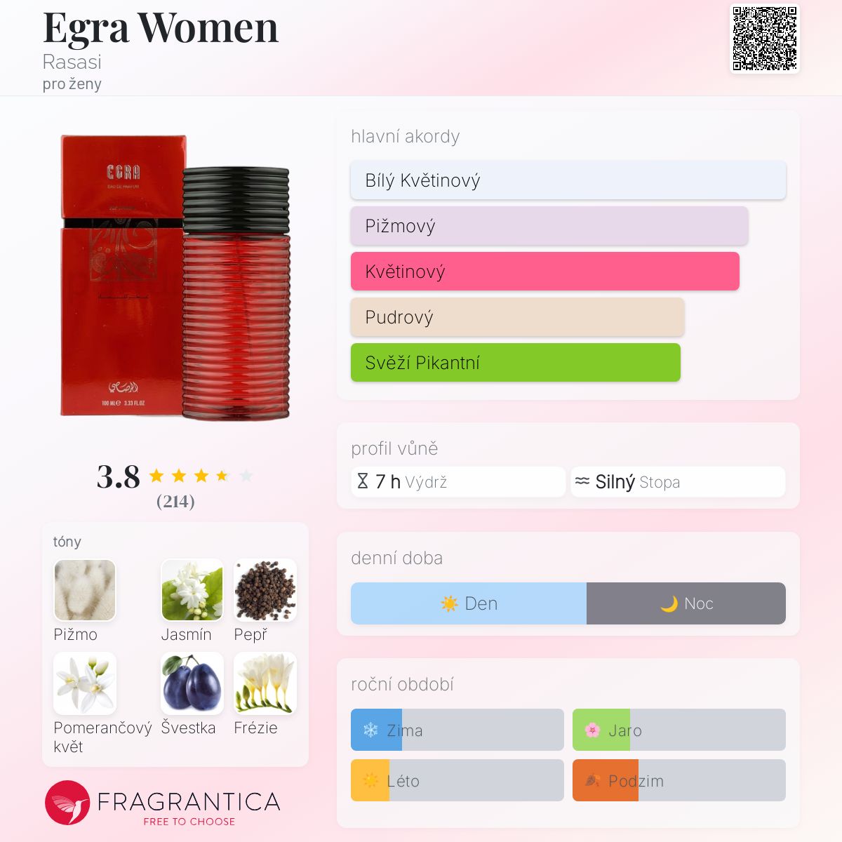 Egra Women podle Rasasi je Floral Woody Musk vůně pro ženy. Vrchní tóny jsou Pepř, Frézie, Leknín a Bergamot; střední tóny jsouJasmín, Pomerančový květ a Švestka ; základní tóny jsou Pižmo, Pačuli a Santalové dřevo.