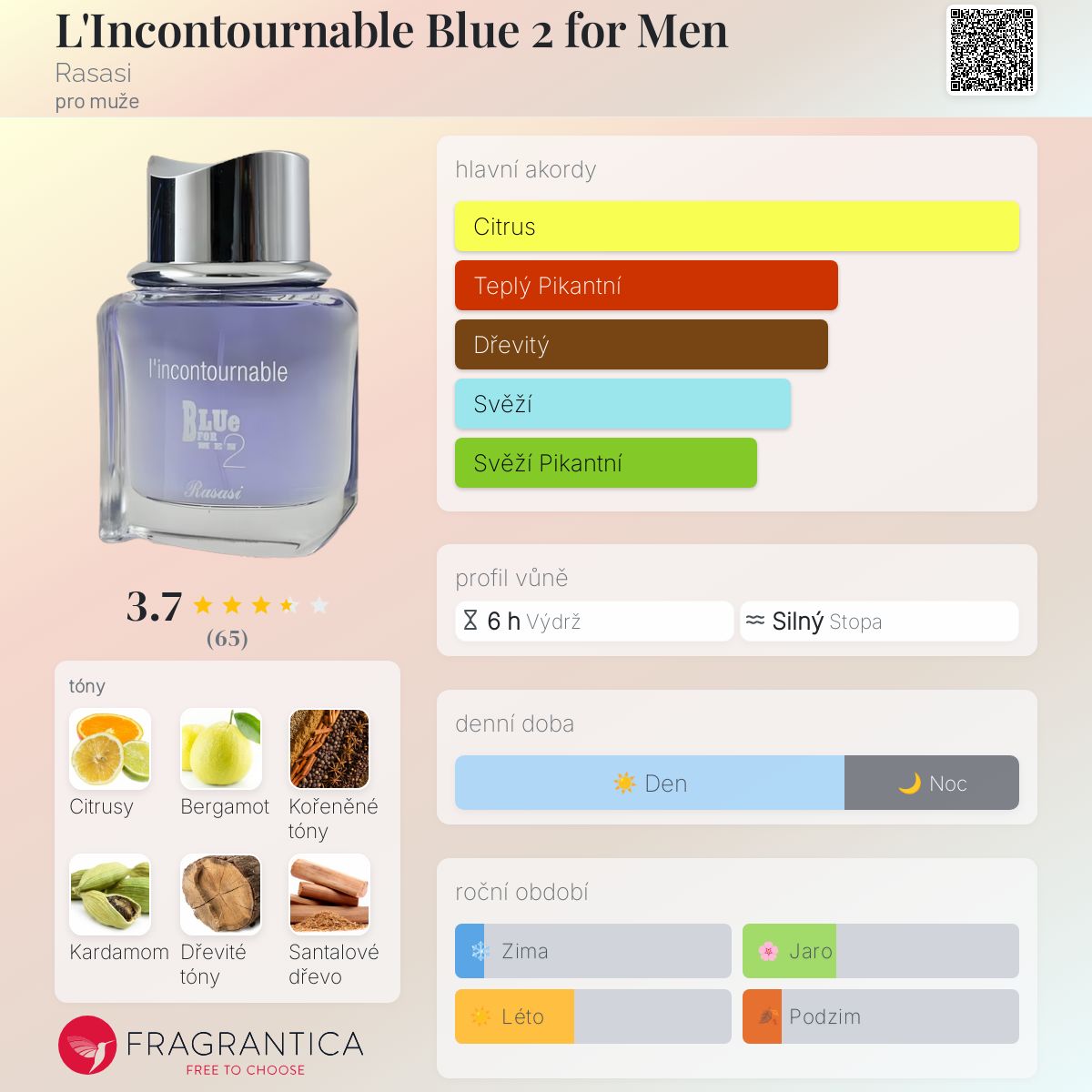 L'Incontournable Blue 2 for Men podle Rasasi je Woody Aromatic vůně pro muže. Vrchní tóny jsou Citrusy, Bergamot a Pelyněk; střední tóny jsouKořeněné tóny, Kardamom a Pelargónie ; základní tóny jsou Dřevité tóny, Santalové dřevo a Pižmo.
