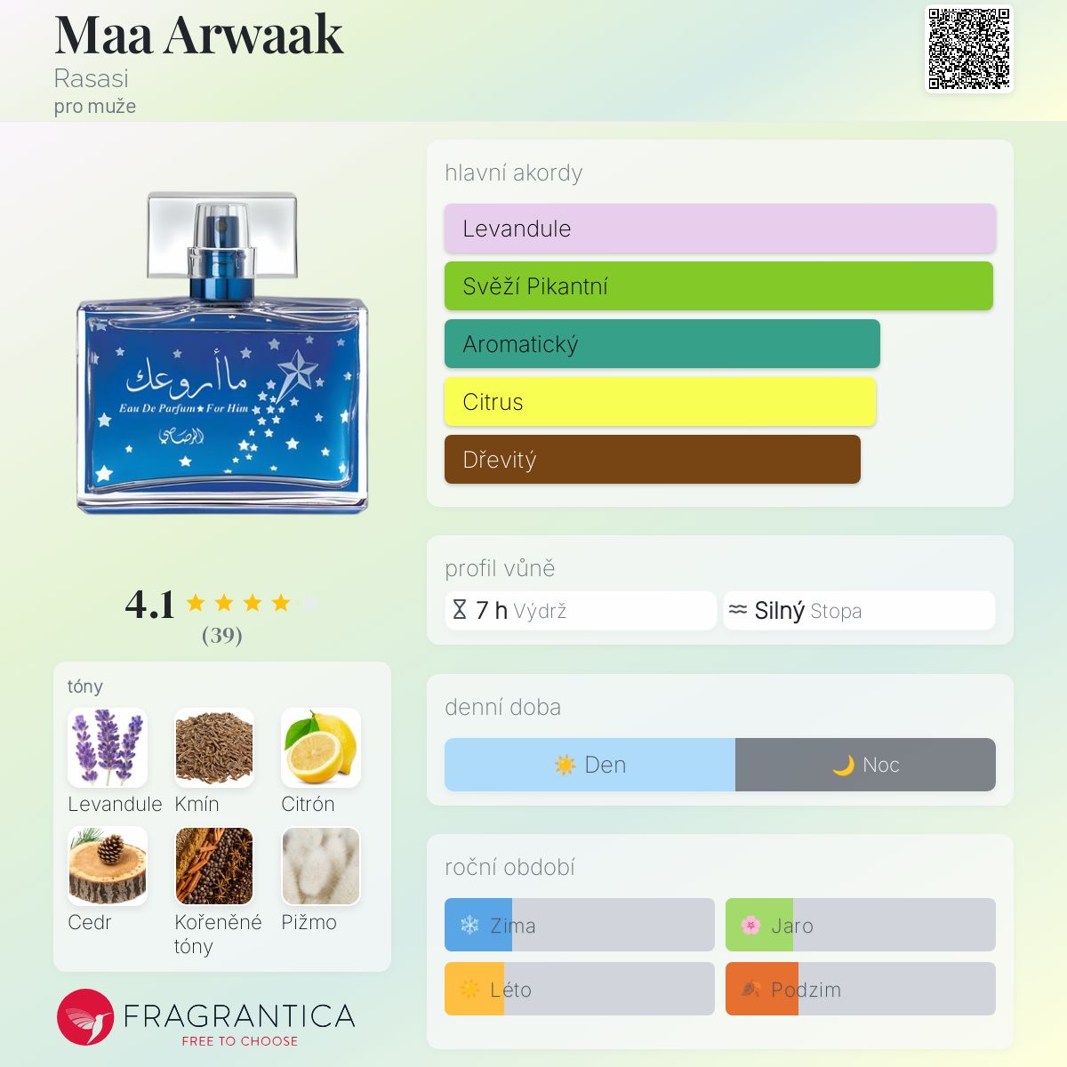 Maa Arwaak podle Rasasi je Woody Aromatic vůně pro muže. Vrchní tóny jsou Levandule a Citrón; střední tóny jsouKmín a Kořeněné tóny ; základní tóny jsou Cedr a Pižmo.