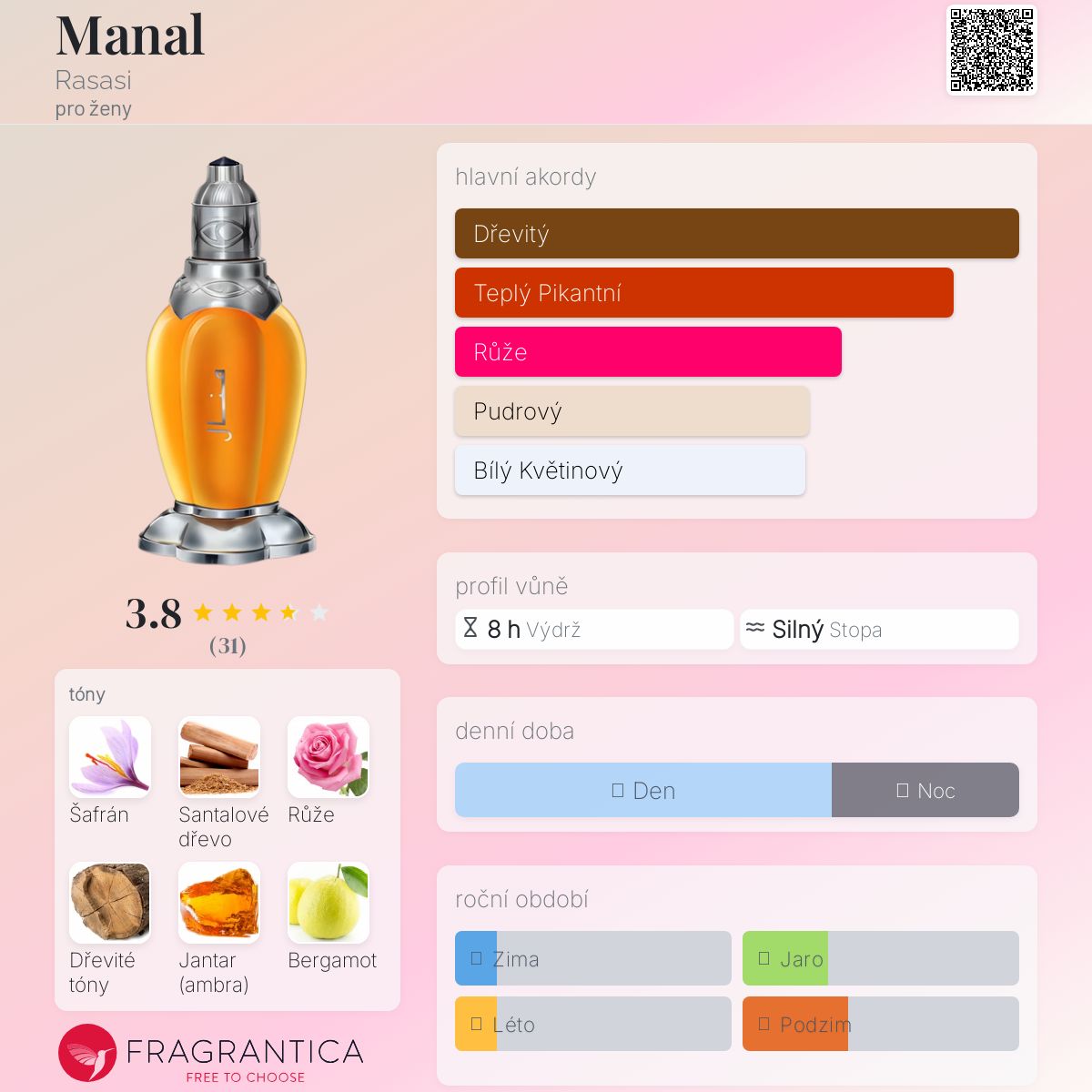 Manal podle Rasasi je Orientální Woody vůně pro ženy. Vrchní tóny jsou Šafrán, Růže a Bergamot; střední tóny jsouSantalové dřevo, Růže, Jasmín a Zimolez ; základní tóny jsou Dřevité tóny, Jantar (ambra) a Pižmo.