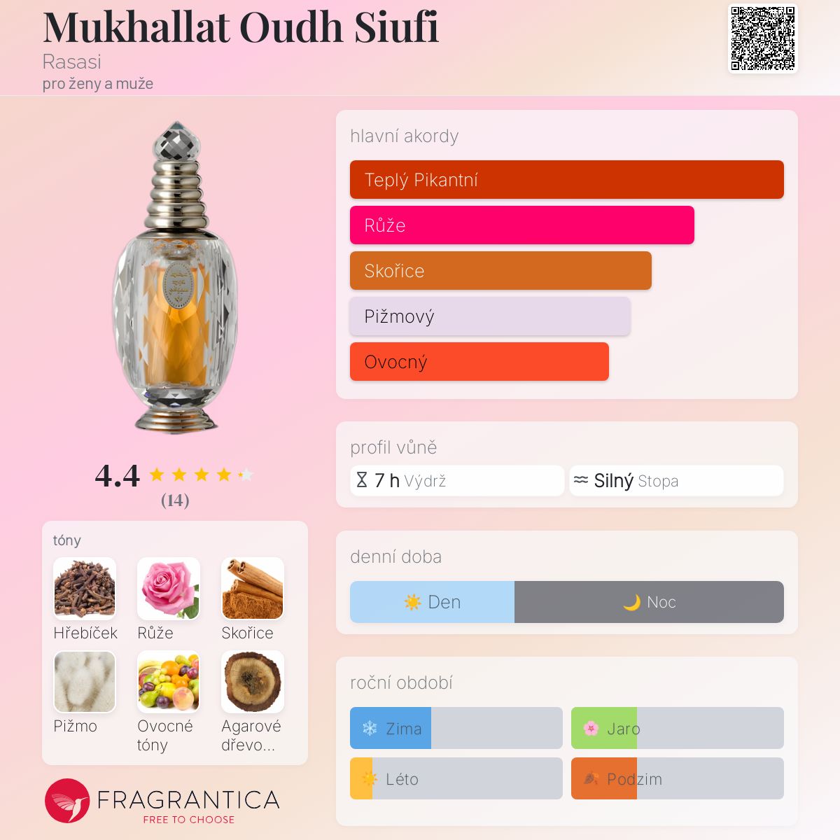 Mukhallat Oudh Siufi podle Rasasi je Orientální Spicy vůně pro ženy a muže. Vrchní tóny jsou Růže, Ovocné tóny a Levandule; střední tóny jsouHřebíček, Skořice a Kardamom ; základní tóny jsou Pižmo, Agarové dřevo (oud) a Santalové dřevo.