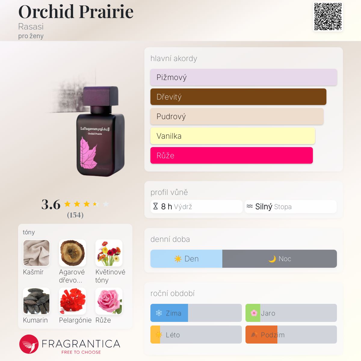 Orchid Prairie podle Rasasi je Orientální Floral vůně pro ženy. Orchid Prairie byl/a uveden/a v roce 2013. Vrchní tóny jsou Květinové tóny, Pelargónie a Růže; střední tóny jsouKašmír, Agarové dřevo (oud) a Kumarin ; základní tóny jsou Agarové dřevo (oud), Pižmo, Vanilka a Jantar (ambra).