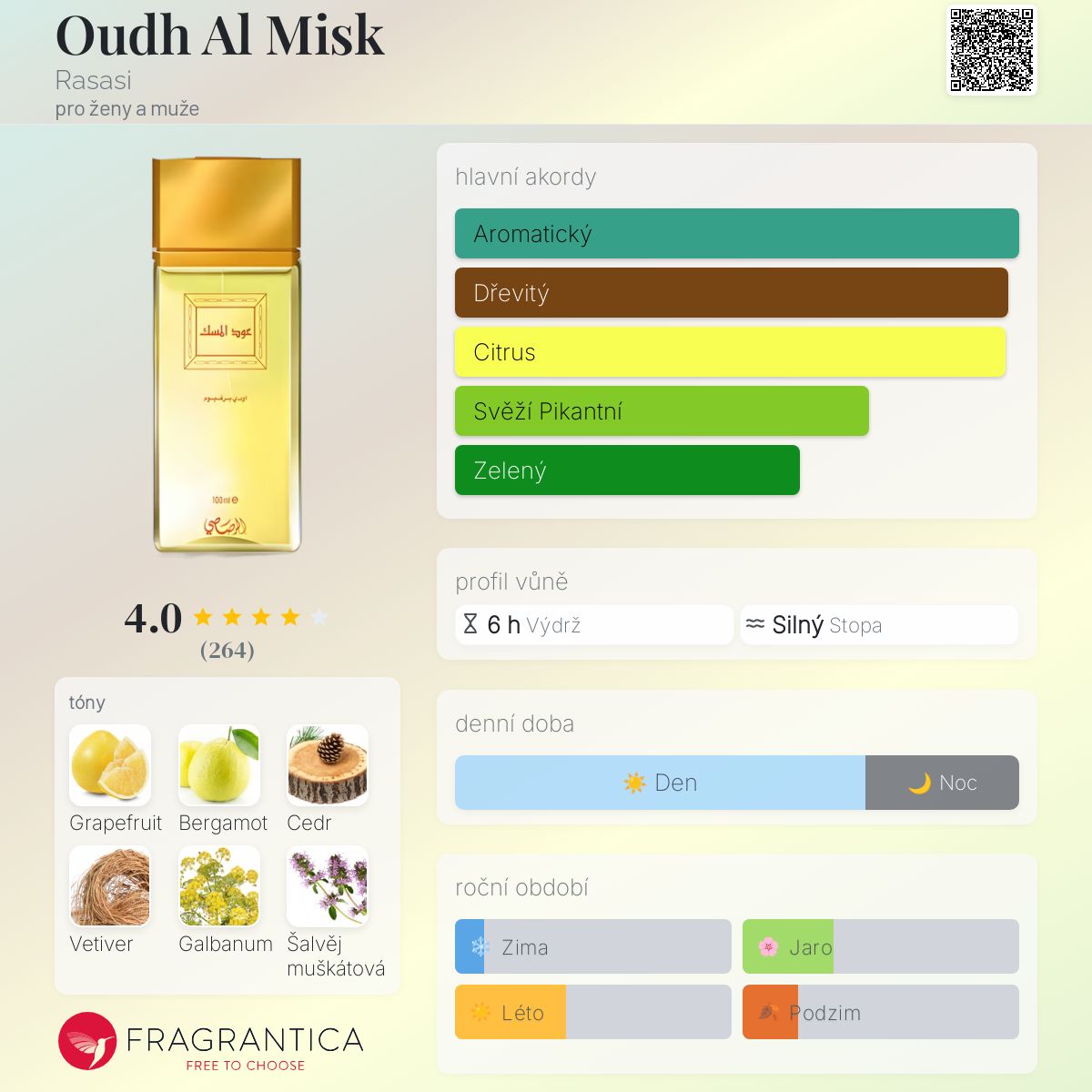 Oudh Al Misk podle Rasasi je Orientální Fougere vůně pro ženy a muže. Vrchní tóny jsou Grapefruit, Bergamot, Galbanum a Šalvěj muškátová; střední tóny jsouPelargónie a Jasmín ; základní tóny jsou Cedr, Vetiver, Pačuli, Santalové dřevo, Pižmo a Ambra.