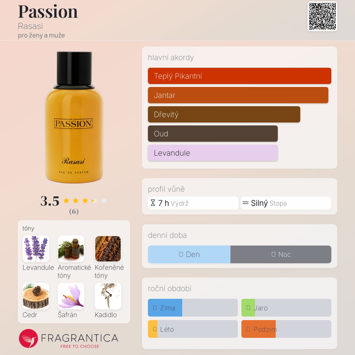 Passion podle Rasasi je Aromatic vůně pro ženy a muže. Passion byl/a uveden/a v roce 2022. Vrchní tóny jsou Levandule, Aromatické tóny a Kořeněné tóny; střední tóny jsouCedr, Šafrán a Kadidlo ; základní tóny jsou Ambra, Mech a Agarové dřevo (oud).