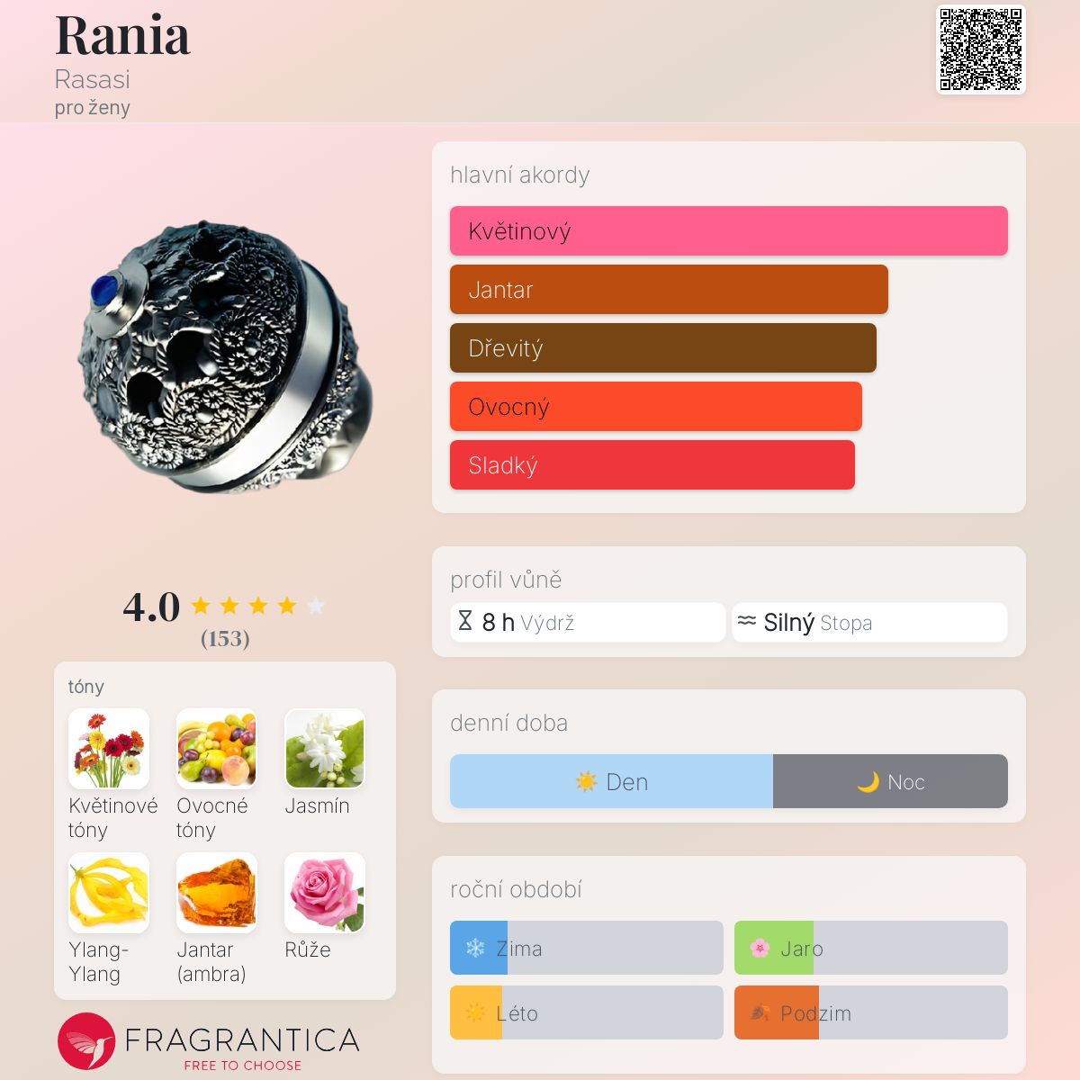 Rania podle Rasasi je Orientální Floral vůně pro ženy. Vrchní tóny jsou Jasmín, Ylang-Ylang a Růže; střední tóny jsouKvětinové tóny a Ovocné tóny ; základní tóny jsou Jantar (ambra), Pryskyřice, Dřevité tóny a Dubový mech.