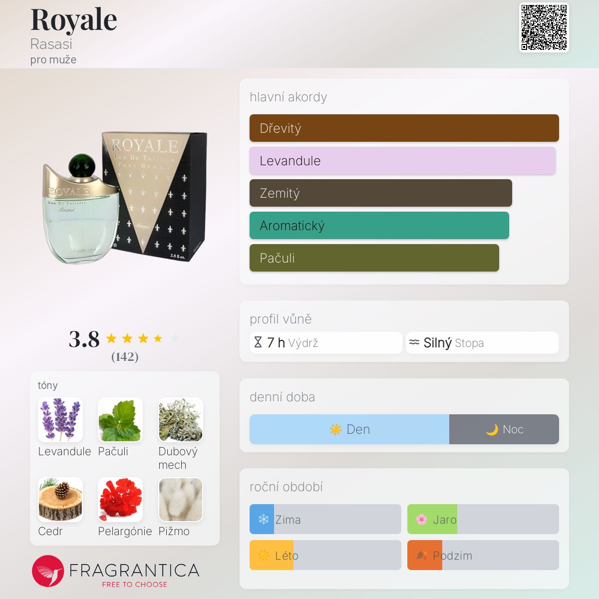 Royale podle Rasasi je Woody Aromatic vůně pro muže. Vrchní tóny jsou Levandule a Pelargónie; střední tóny jsouCedr a Skořice ; základní tóny jsou Pačuli, Mech, Pižmo a Jantar (ambra).
