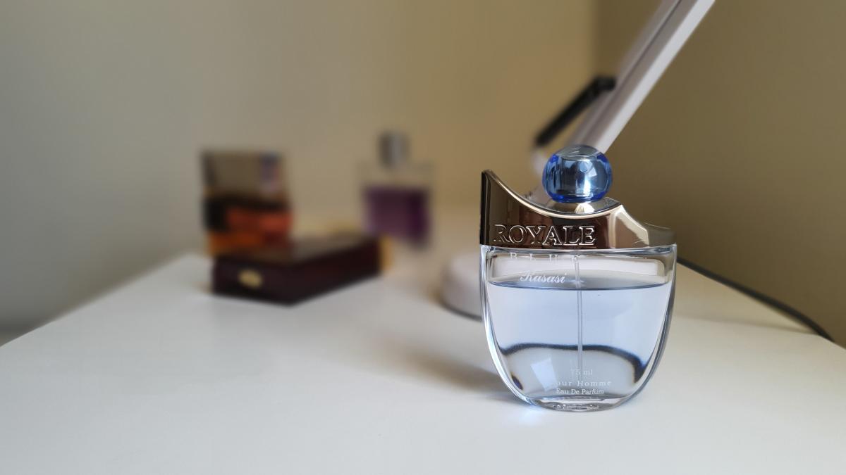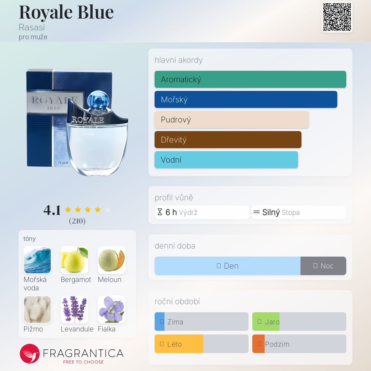 Royale Blue podle Rasasi je Woody Floral Musk vůně pro muže. Vrchní tóny jsou Mořské tóny, Bergamot, Meloun a Galbanum; střední tóny jsouLevandule, Fialka, Jasmín a Růže ; základní tóny jsou Pižmo, Santalové dřevo, Cedr, Jantar (ambra) a Pačuli.