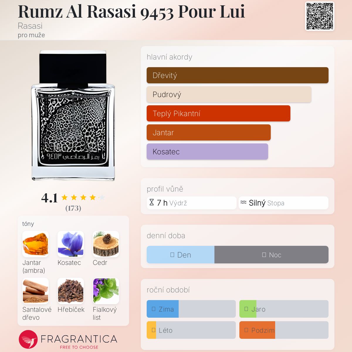 Rumz Al Rasasi 9453 Pour Lui podle Rasasi je Orientální Woody vůně pro muže. Vrchní tóny jsou Hřebíček a Fialkový list; střední tóny jsouKosatec a Cedr ; základní tóny jsou Jantar (ambra), Santalové dřevo, Vanilka, Pačuli a Pižmo.