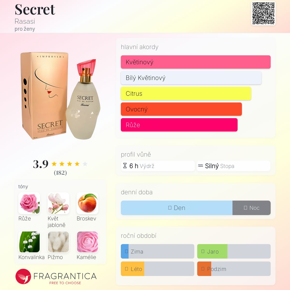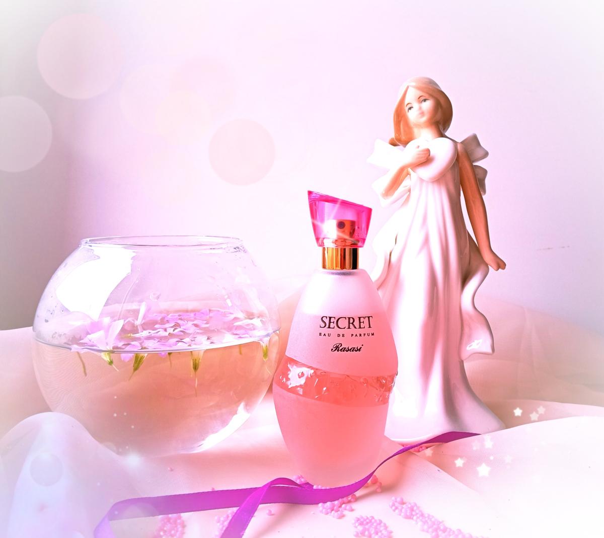 Secret podle Rasasi je Floral Fruity vůně pro ženy. Vrchní tóny jsou Květ jabloně , Broskev, Kamélie, Pomeranč a Fialkový list; střední tóny jsouRůže, Konvalinka a Mandarinka, Jasmín a Mandarinka ; základní tóny jsou Pižmo, Zimolez, Cedr a Santalové dřevo.