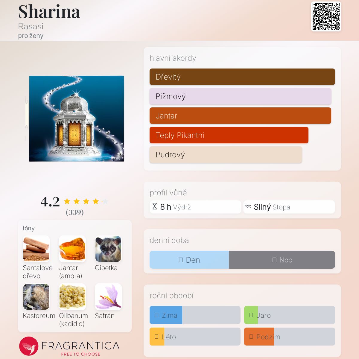 Sharina podle Rasasi je Orientální Floral vůně pro ženy. Vrchní tóny jsou Santalové dřevo, Ylang-Ylang, Pelargónie, Růže, Pačuli a Kozlík lékařský; střední tóny jsouCibetka, Kastoreum, Olibanum, Šafrán a Chrpovník lopuchový ; základní tóny jsou Jantar (ambra) a Pižmo.