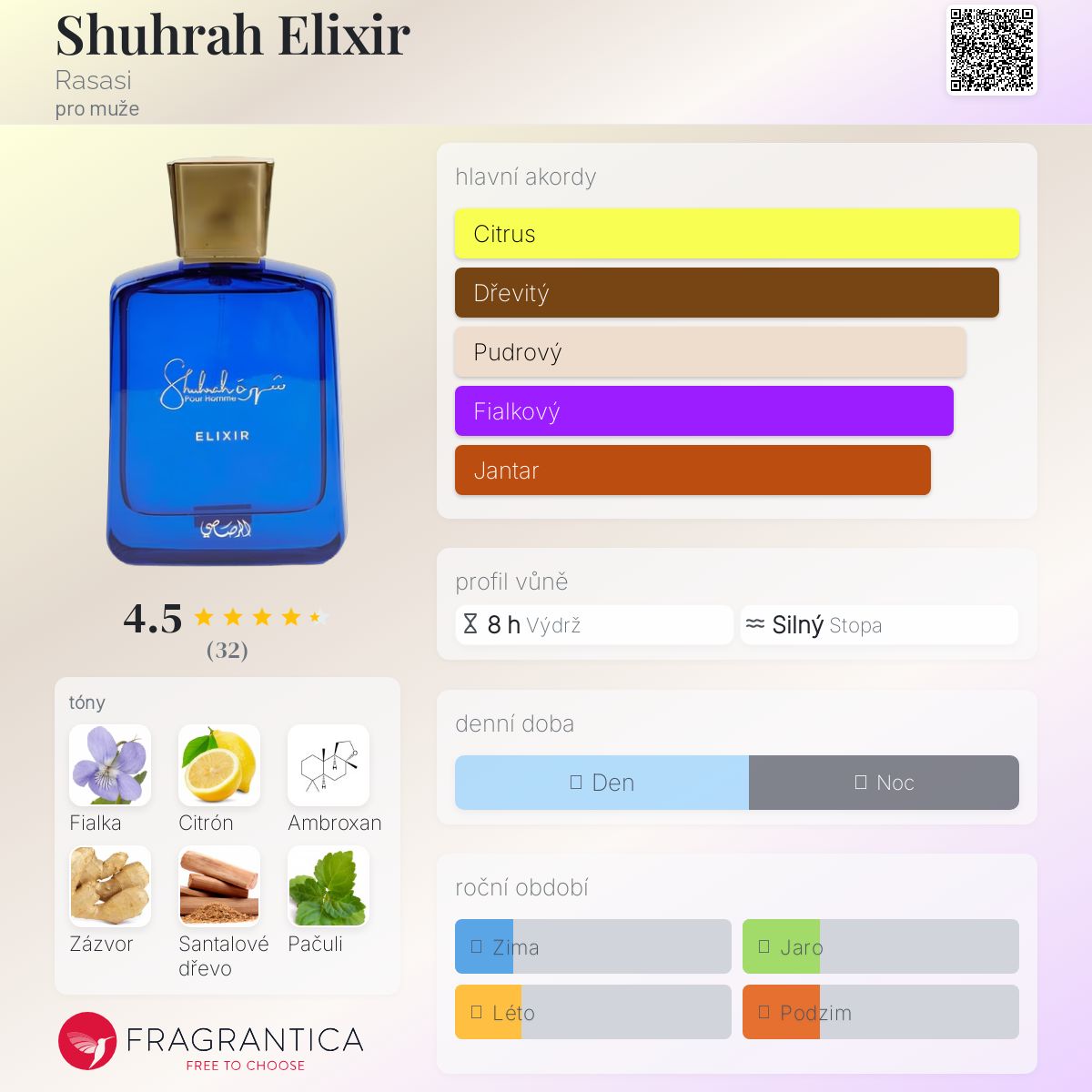 Shuhrah Elixir podle Rasasi je vůně pro muže. Toto je nová vůně. Shuhrah Elixir byl/a uveden/a v roce 2025. Vrchní tóny jsou Citrón, Zázvor a Mandarinka; střední tóny jsouFialka, Růže a Jantar (ambra) ; základní tóny jsou Ambroxan, Santalové dřevo, Pačuli a Agarové dřevo (oud).