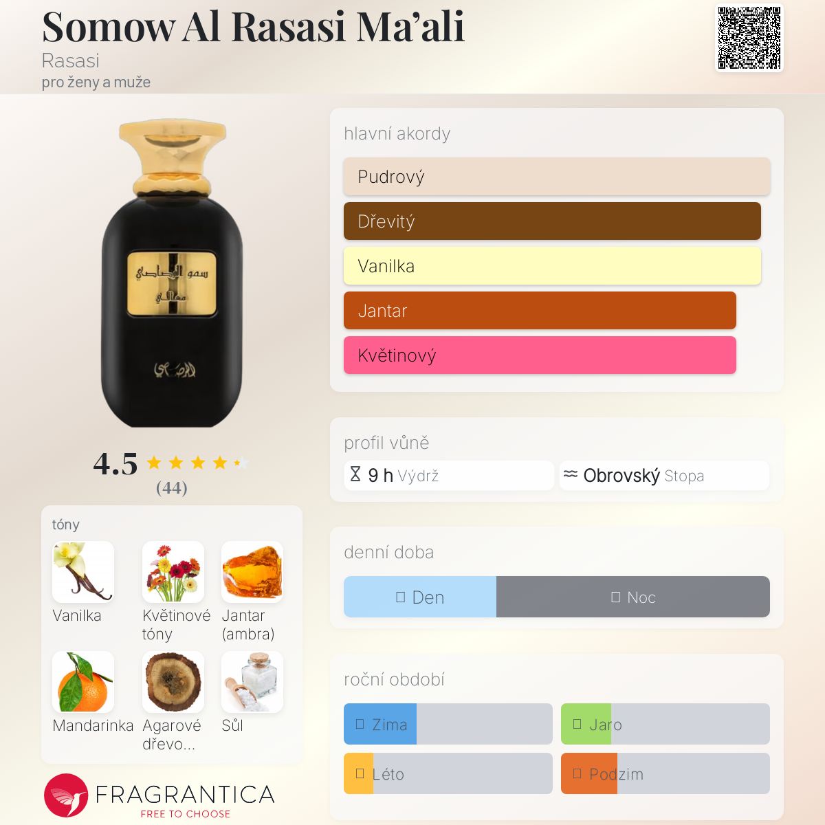 Somow Al Rasasi Ma’ali podle Rasasi je vůně pro ženy a muže. Somow Al Rasasi Ma’ali byl/a uveden/a v roce 2021. Vrchní tóny jsou Vanilka, Mandarinka a Lískový oříšek; střední tóny jsouKvětinové tóny, Jantar (ambra) a Sůl ; základní tóny jsou Agarové dřevo (oud), Santalové dřevo a Pižmo.