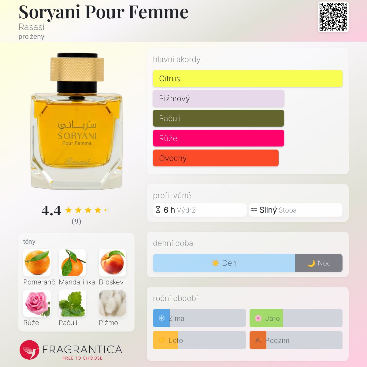 Soryani Pour Femme podle Rasasi je Floral vůně pro ženy. Soryani Pour Femme byl/a uveden/a v roce 2022. Vrchní tóny jsou Pomeranč a Mandarinka; střední tóny jsouBroskev a Růže ; základní tóny jsou Pačuli a Pižmo.