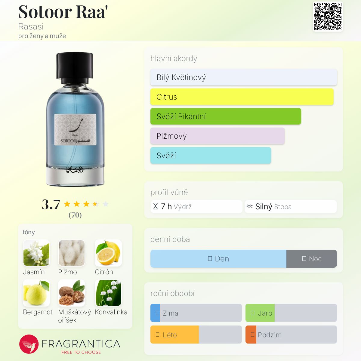 Sotoor Raa' podle Rasasi je vůně pro ženy a muže. Sotoor Raa' byl/a uveden/a v roce 2017. Vrchní tóny jsou Citrón a Bergamot; střední tóny jsouJasmín, Muškátový oříšek a Konvalinka ; základní tóny jsou Pižmo a Pačuli.