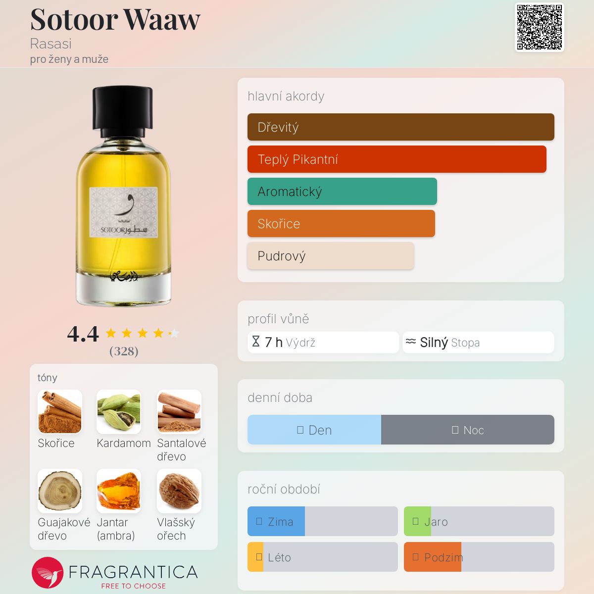 Sotoor Waaw podle Rasasi je Woody vůně pro ženy a muže. Sotoor Waaw byl/a uveden/a v roce 2017. Vrchní tóny jsou Skořice, Kardamom, Vlašský ořech, Šafrán a Pepř; střední tóny jsouGurjanský balzám a Levandule ; základní tóny jsou Santalové dřevo, Guajakové dřevo, Jantar (ambra), Cedr a Vetiver.