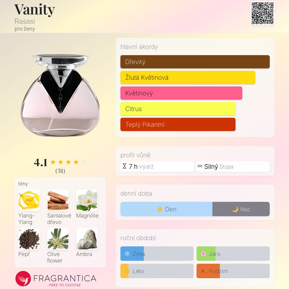 Vanity podle Rasasi je Floral Woody Musk vůně pro ženy. Vanity byl/a uveden/a v roce 2014. Vrchní tóny jsou Ylang-Ylang, Pepř, Citrón a Bergamot; střední tóny jsouMagnólie, Olivový květ a Skořice ; základní tóny jsou Santalové dřevo, Ambra a Pižmo.