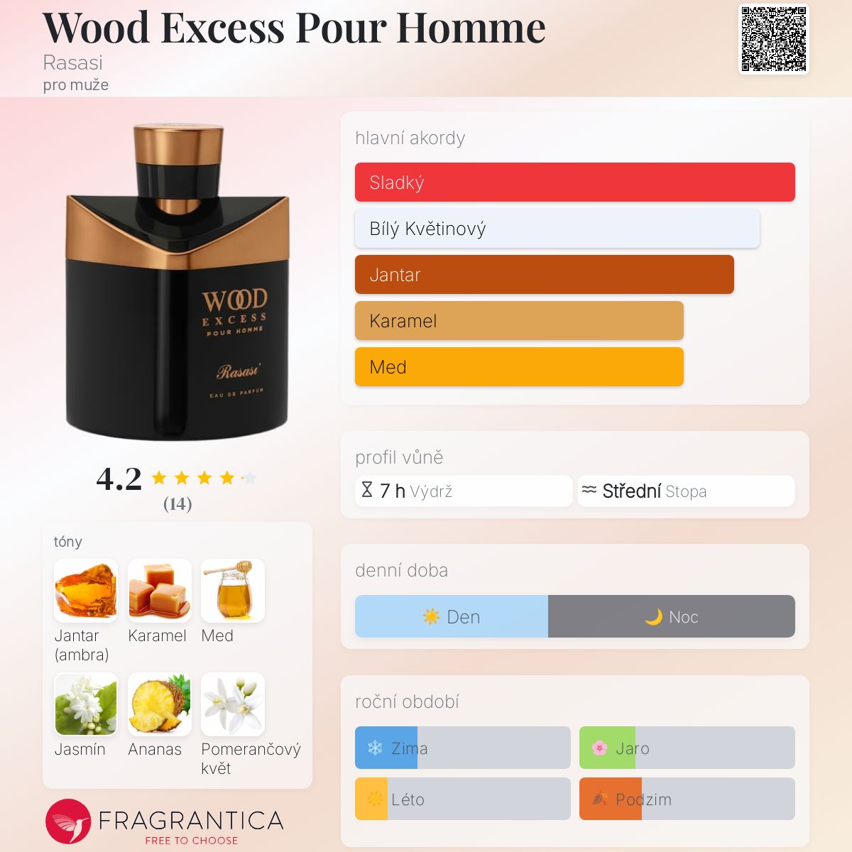 Wood Excess Pour Homme podle Rasasi je Orientální Woody vůně pro muže. Wood Excess Pour Homme byl/a uveden/a v roce 2022. Vrchní tóny jsou Ananas a Citrusy; střední tóny jsouJasmín, Pomerančový květ, Fialka a Růže ; základní tóny jsou Jantar (ambra), Karamel, Med a Vanilka.
