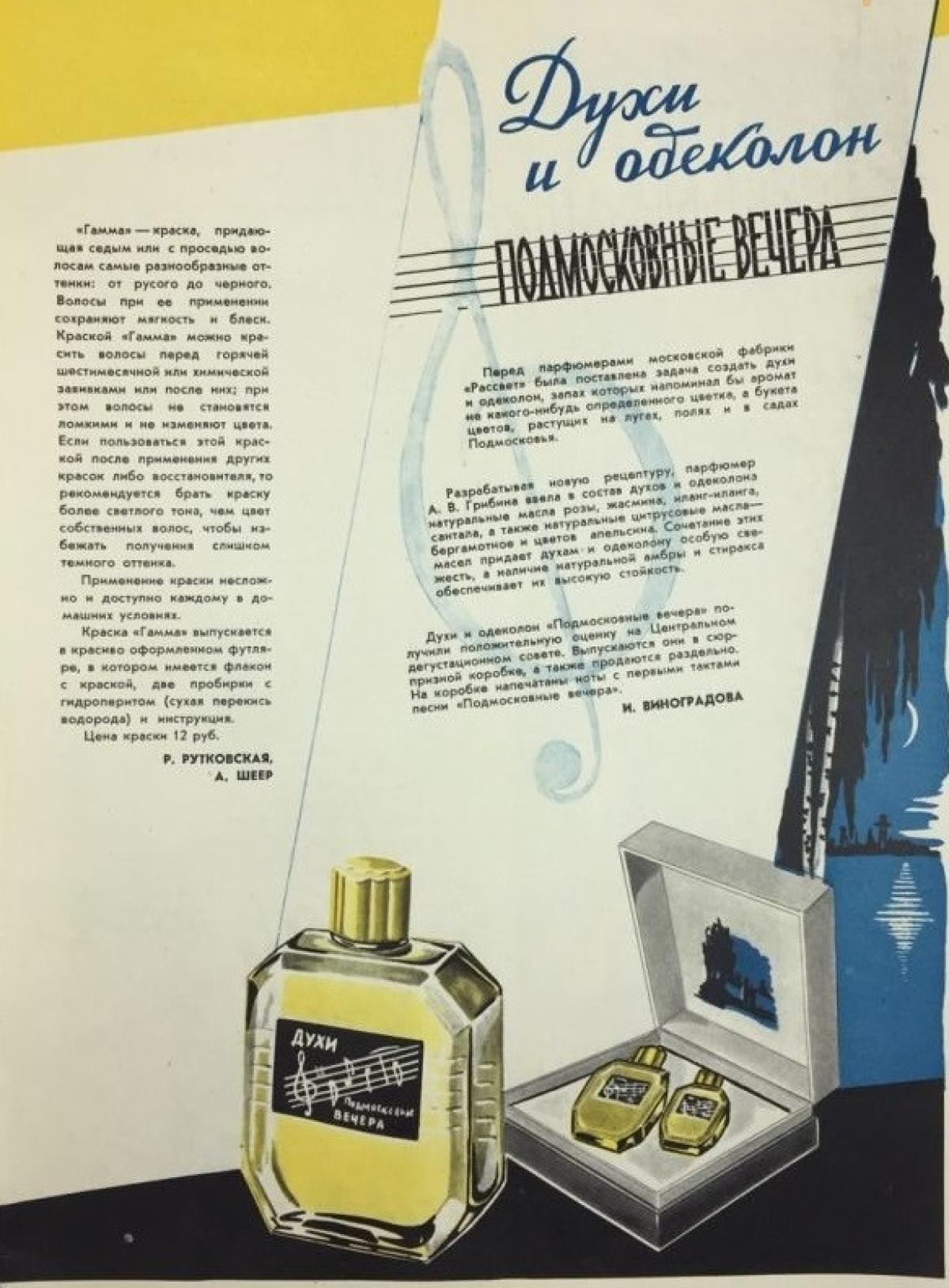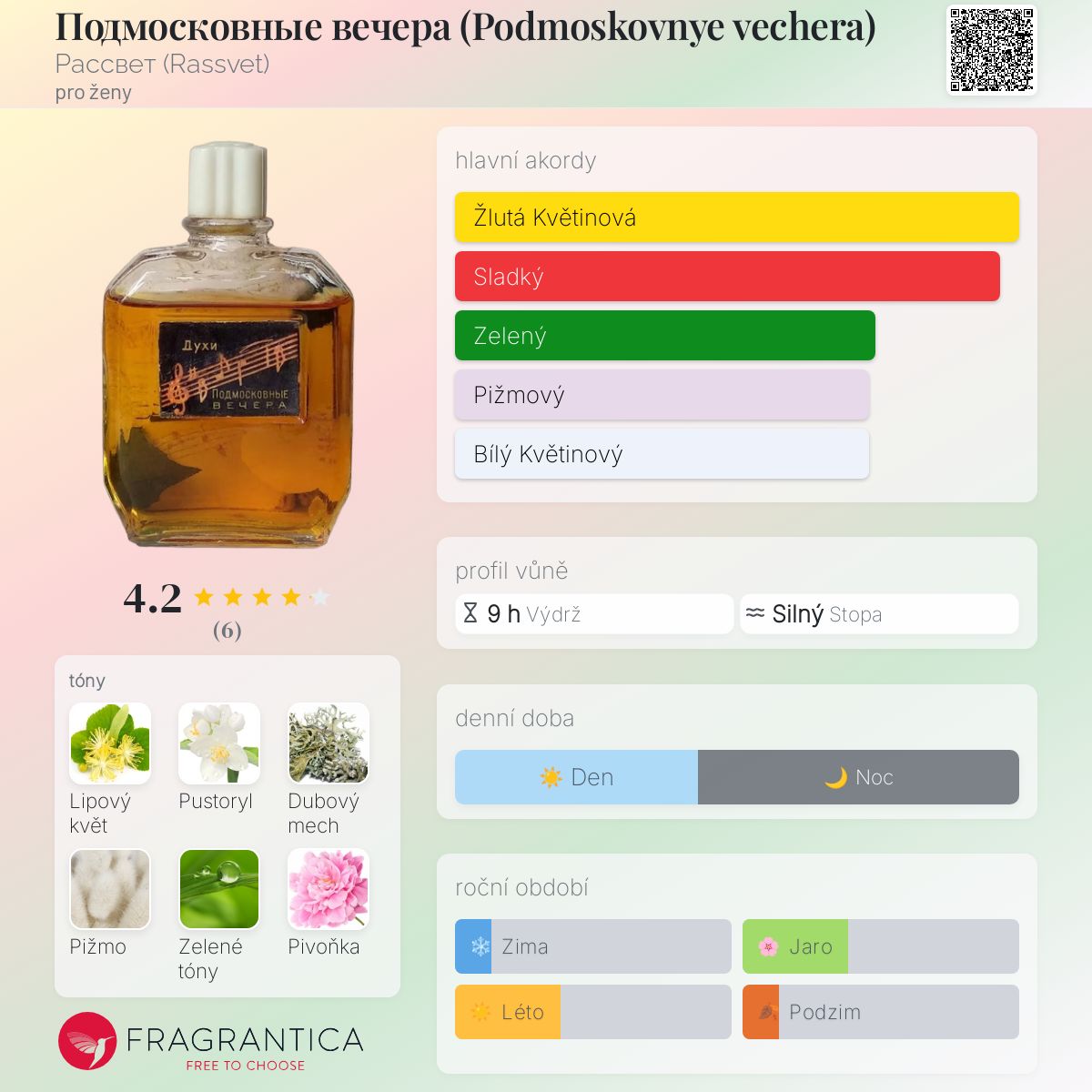 Подмосковные вечера (Podmoskovnye vechera) podle Рассвет (Rassvet) je Floral Green vůně pro ženy. Подмосковные вечера (Podmoskovnye vechera) byl/a uveden/a v roce 1960. "Nosem" za touto vůní je Alla Gribina. Vrchní tóny jsou Pustoryl, Zelené tóny a Růže de Mai; střední tóny jsouLipový květ, Pivoňka a Tabákový květ ; základní tóny jsou Dubový mech, Pižmo, Benzoin a Vetiver.