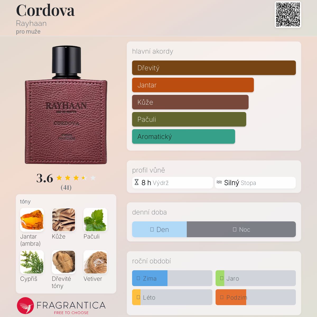 Cordova podle Rayhaan je vůně pro muže. Cordova byl/a uveden/a v roce 2023. Vrchní tón je Kůže ; střední tóny jsouPačuli a Cypřiš ; základní tóny jsou Jantar (ambra), Dřevité tóny a Vetiver.