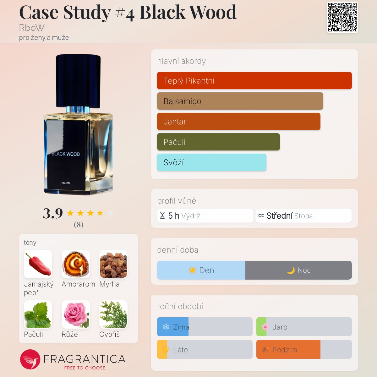 Case Study #4 Black Wood podle RboW je Aromatic Spicy vůně pro ženy a muže. Case Study #4 Black Wood byl/a uveden/a v roce 2023. "Nosem" za touto vůní je Claude Dir. Vrchní tóny jsou Jamajský pepř, Bergamot a Citrón; střední tóny jsouMyrha, Růže, Cypřiš, Labdanum, Cypriolový olej a Hřebíček ; základní tóny jsou Ambrarom, Pačuli, Labdanum, Kadidlo, Santalové dřevo, Cedr, Kůže, Vetiver a Pižmo.