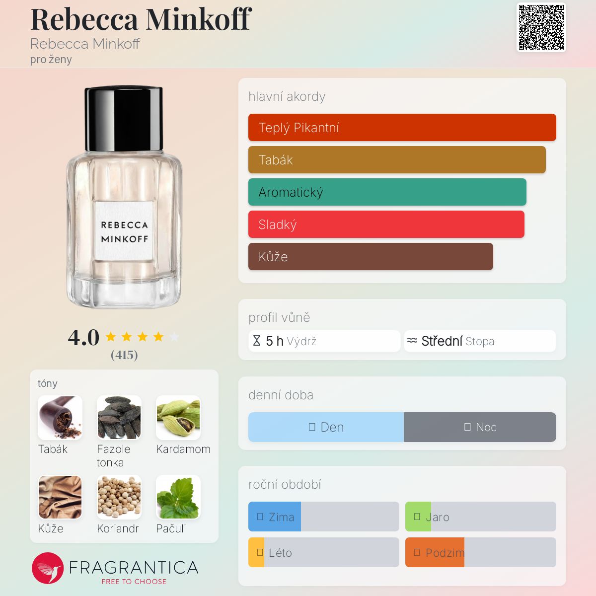 Rebecca Minkoff podle Rebecca Minkoff je Orientální Floral vůně pro ženy. Rebecca Minkoff byl/a uveden/a v roce 2020. Rebecca Minkoff byl/a vytvořen/a Rodrigo Flores-Roux a Linda Song. Vrchní tóny jsou Kardamom, Koriandr a Bergamot; střední tóny jsouTabák, Jasmín a Amyl Salicylate ; základní tóny jsou Fazole tonka, Kůže, Pačuli a Labdanum.