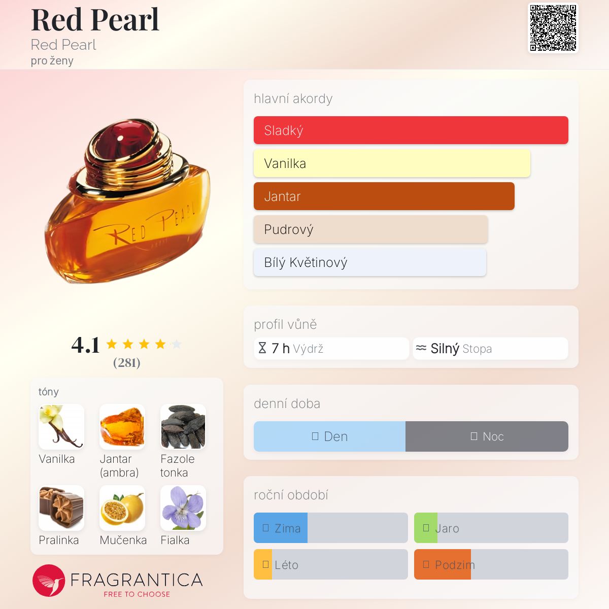 Red Pearl podle Red Pearl je Orientální Vanilla vůně pro ženy. Red Pearl byl/a uveden/a v roce 1999. Vrchní tóny jsou Mučenka, Fialka, Brazilské růžové dřevo, Černý rybíz a Bergamot; střední tóny jsouTuberóza, Jasmín, Růže a Pelargónie ; základní tóny jsou Vanilka, Jantar (ambra), Fazole tonka, Pralinka a Pižmo.