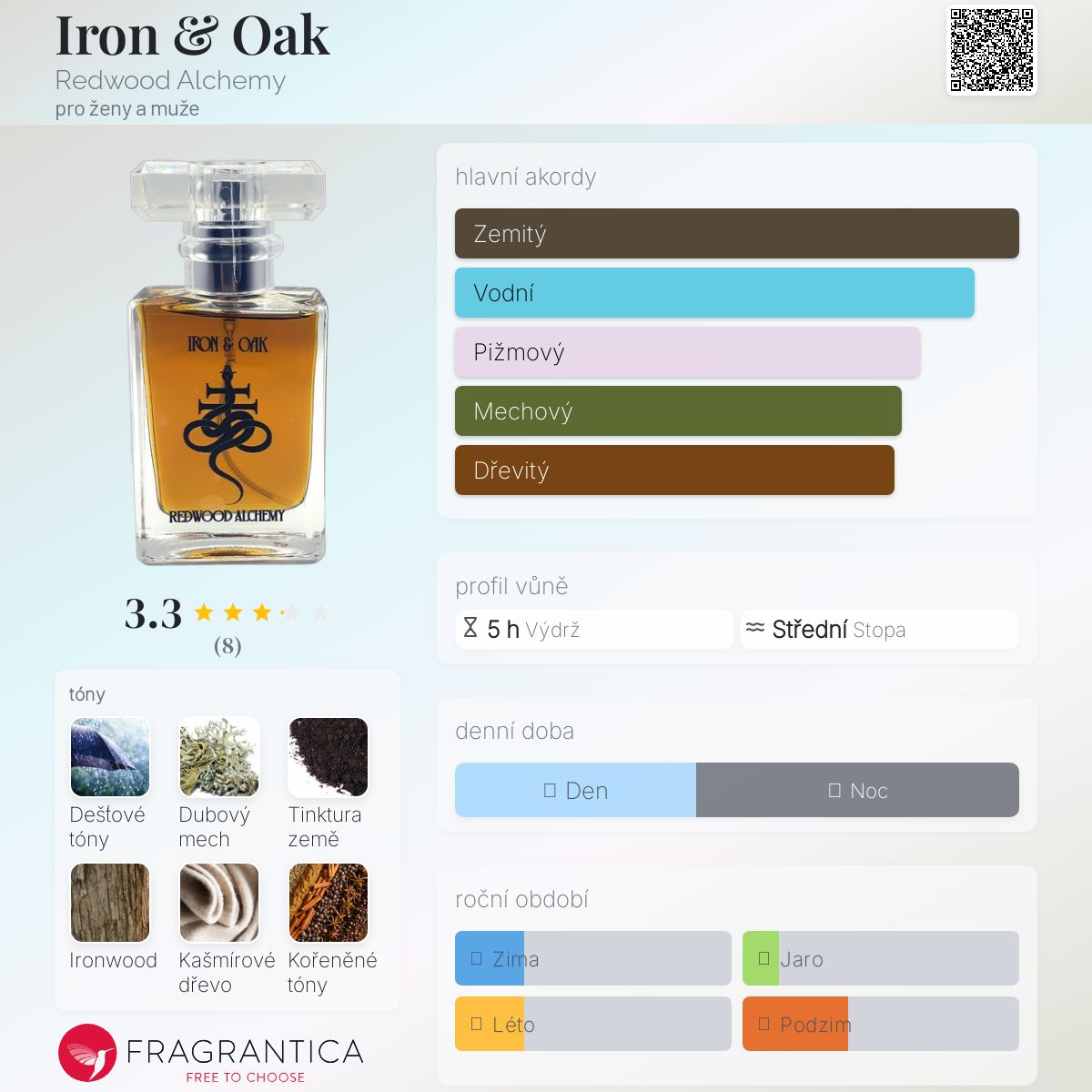 Iron & Oak podle Redwood Alchemy je vůně pro ženy a muže. Iron & Oak byl/a uveden/a v roce 2020. Vrchní tóny jsou Dešťové tóny, Půdní tinktura a Kořeněné tóny; střední tóny jsouŽelezné dřevo a Konvalinka ; základní tóny jsou Dubový mech, Kašmírové dřevo a Pižmo.