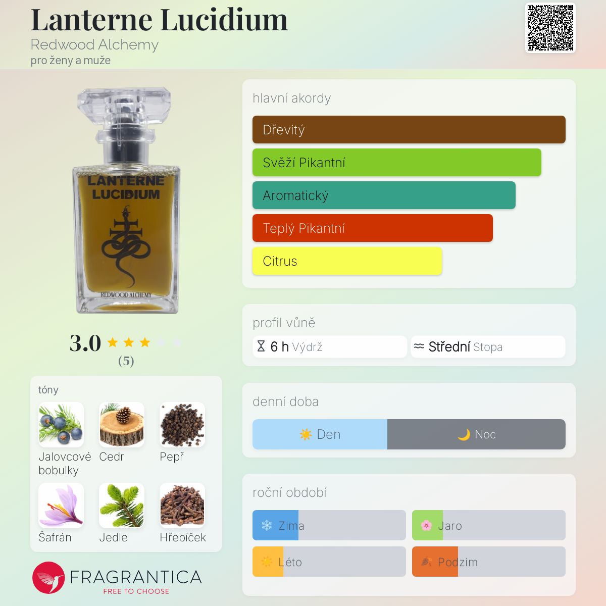 Lanterne Lucidium podle Redwood Alchemy je vůně pro ženy a muže. Lanterne Lucidium byl/a uveden/a v roce 2022. Vrchní tóny jsou Černý pepř, Petitgrain, Krvavý pomeranč a Bergamot; střední tóny jsouJalovcové bobulky, Šafrán, Jedle, Hřebíček, Jasmín a Sladké tóny ; základní tóny jsou Cedr, Cibetka, Ambra a Černý jedlovec (Tsuga).