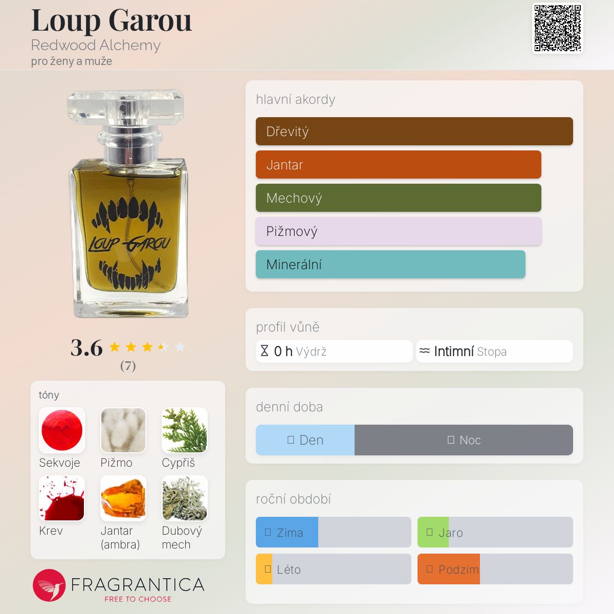 Loup Garou podle Redwood Alchemy je vůně pro ženy a muže. Loup Garou byl/a uveden/a v roce 2020. Vrchní tón je Sekvoje ; střední tóny jsouPřírodní pižmo, Cypřiš a Krev ; základní tóny jsou Jantar (ambra) a Dubový mech.