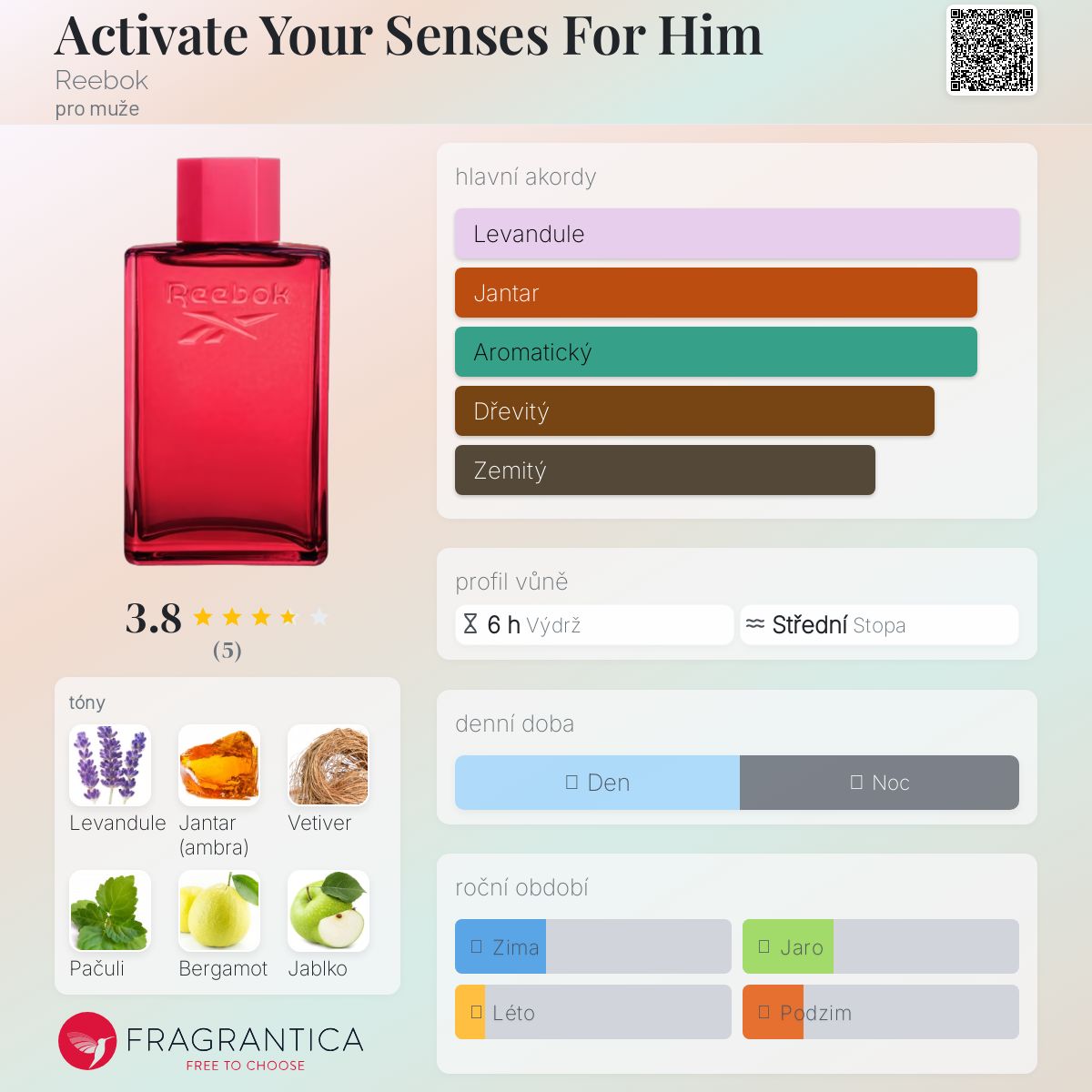 Activate Your Senses For Him podle Reebok je Woody Aromatic vůně pro muže. Toto je nová vůně. Activate Your Senses For Him byl/a uveden/a v roce 2024. Vrchní tóny jsou Bergamot a Jablko; střední tóny jsouLevandule a Pačuli ; základní tóny jsou Jantar (ambra) a Vetiver.
