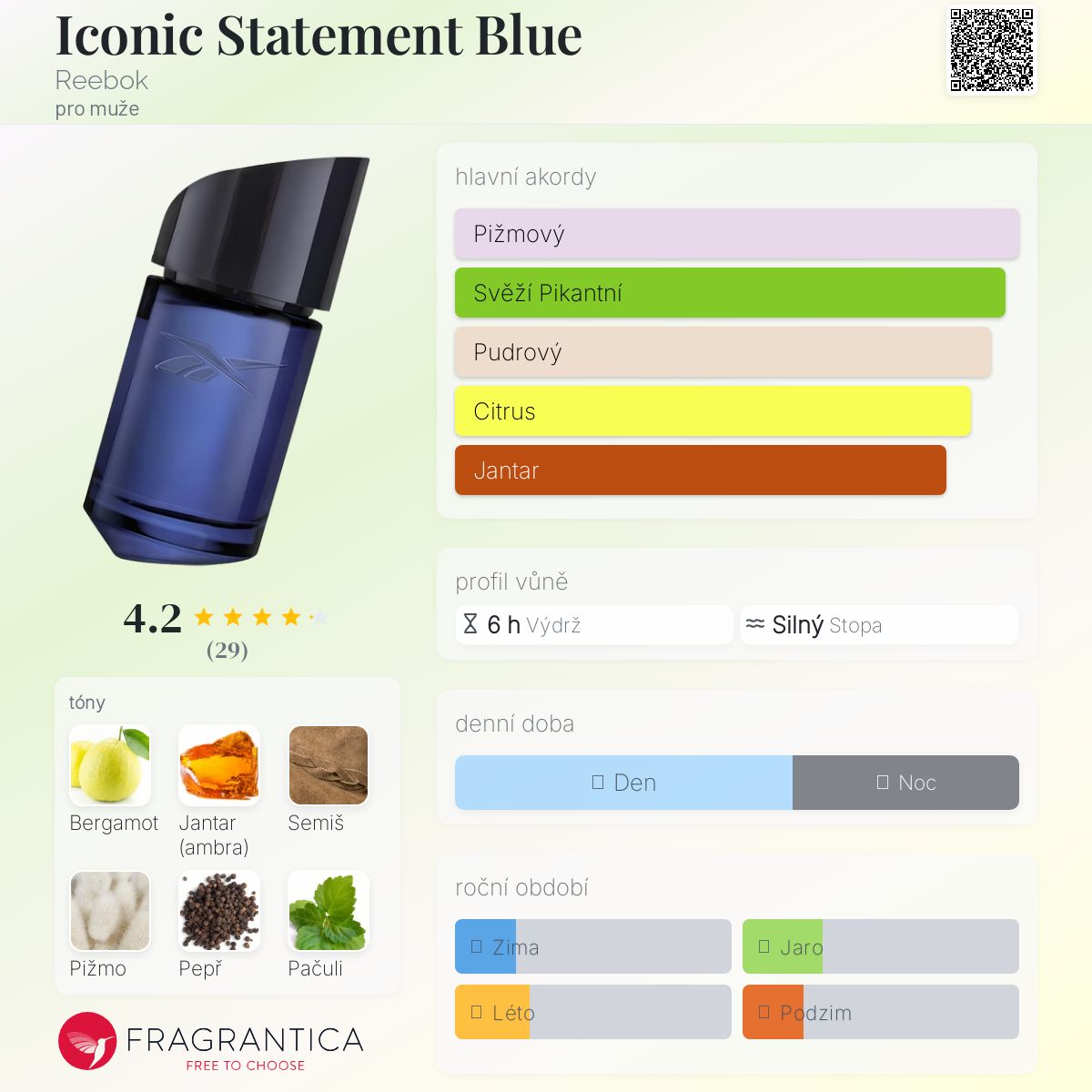 Iconic Statement Blue podle Reebok je Orientální Woody vůně pro muže. Toto je nová vůně. Iconic Statement Blue byl/a uveden/a v roce 2024. Vrchní tóny jsou Bergamot, Pepř a Kardamom; střední tóny jsouSemiš, Pačuli a Jablko ; základní tóny jsou Jantar (ambra), Pižmo a Santalové dřevo.