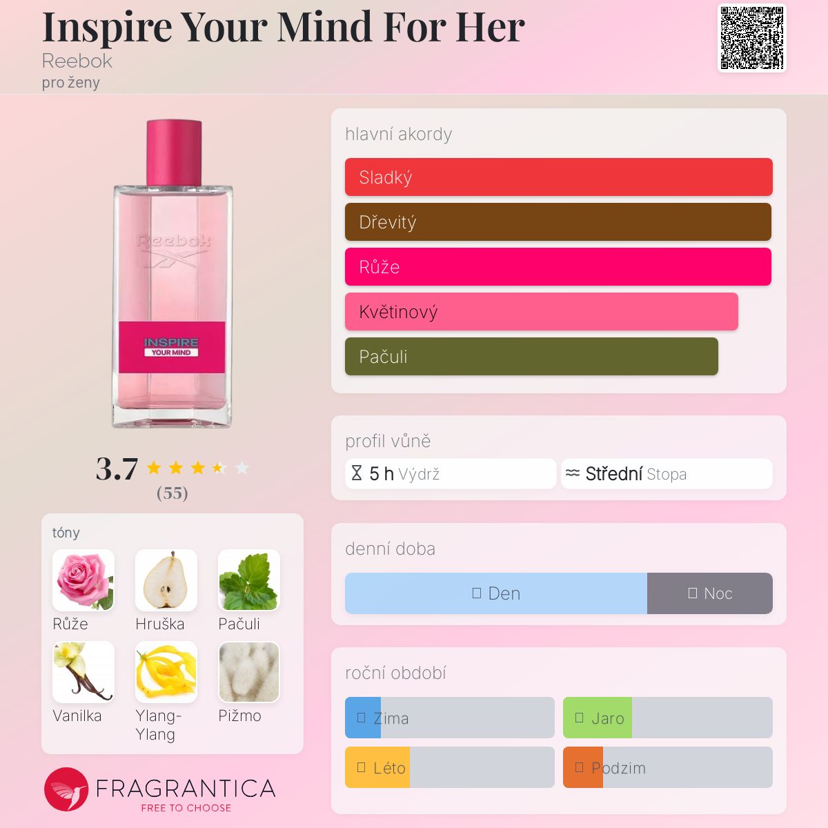 Inspire Your Mind For Her podle Reebok je Orientální Floral vůně pro ženy. Inspire Your Mind For Her byl/a uveden/a v roce 2022. Vrchní tóny jsou Hruška, Pistácie a Bergamot; střední tóny jsouRůže, Ylang-Ylang a Magnólie ; základní tóny jsou Pačuli, Vanilka a Pižmo.