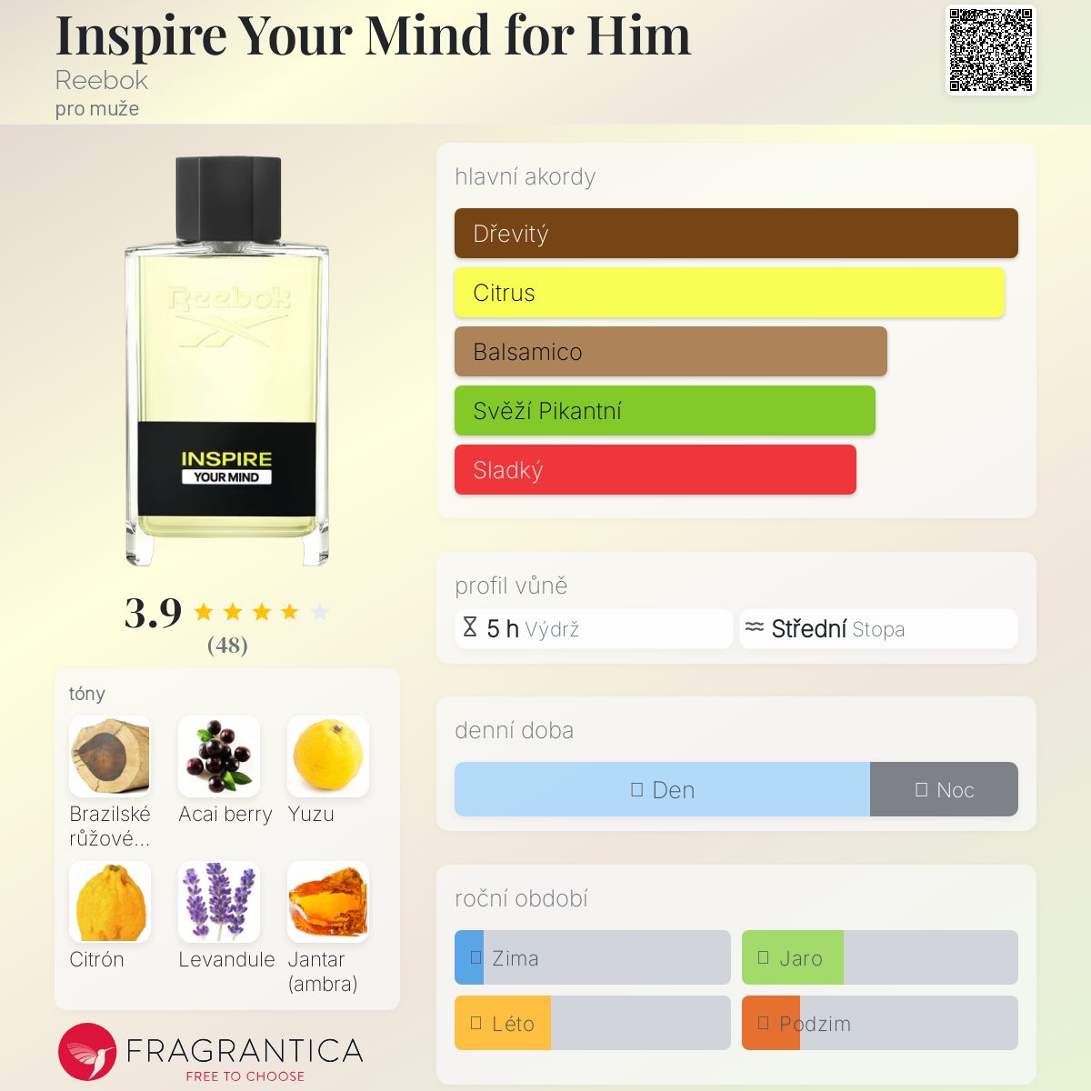 Inspire Your Mind for Him podle Reebok je Woody Aromatic vůně pro muže. Inspire Your Mind for Him byl/a uveden/a v roce 2023. "Nosem" za touto vůní je Guillaume Flavigny. Vrchní tóny jsou Yuzu, Citrón, Acai berry, Levandule a Bílý pepř; střední tóny jsouBrazilské růžové dřevo, Kaktus a Cypriolový olej ; základní tóny jsou Jantar (ambra), Amyris a Vanilka.