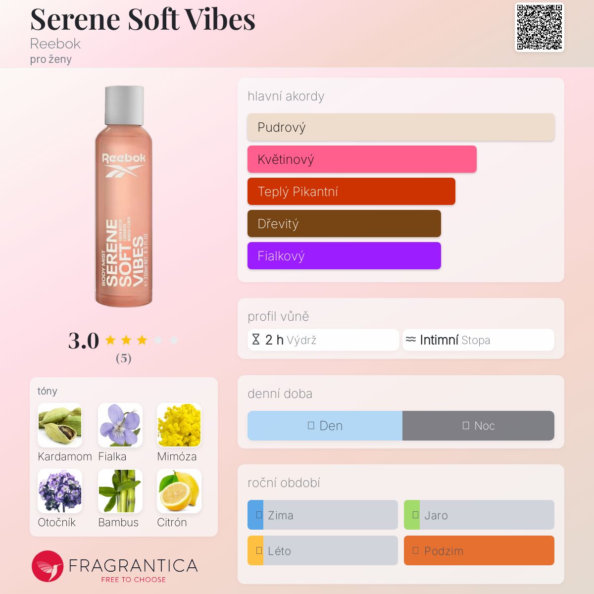Serene Soft Vibes podle Reebok je Orientální Floral vůně pro ženy. Vrchní tóny jsou Kardamom, Bambus a Citrón; střední tóny jsouFialka, Mimóza a Pivoňka ; základní tóny jsou Otočník, Santalové dřevo a Pižmo.