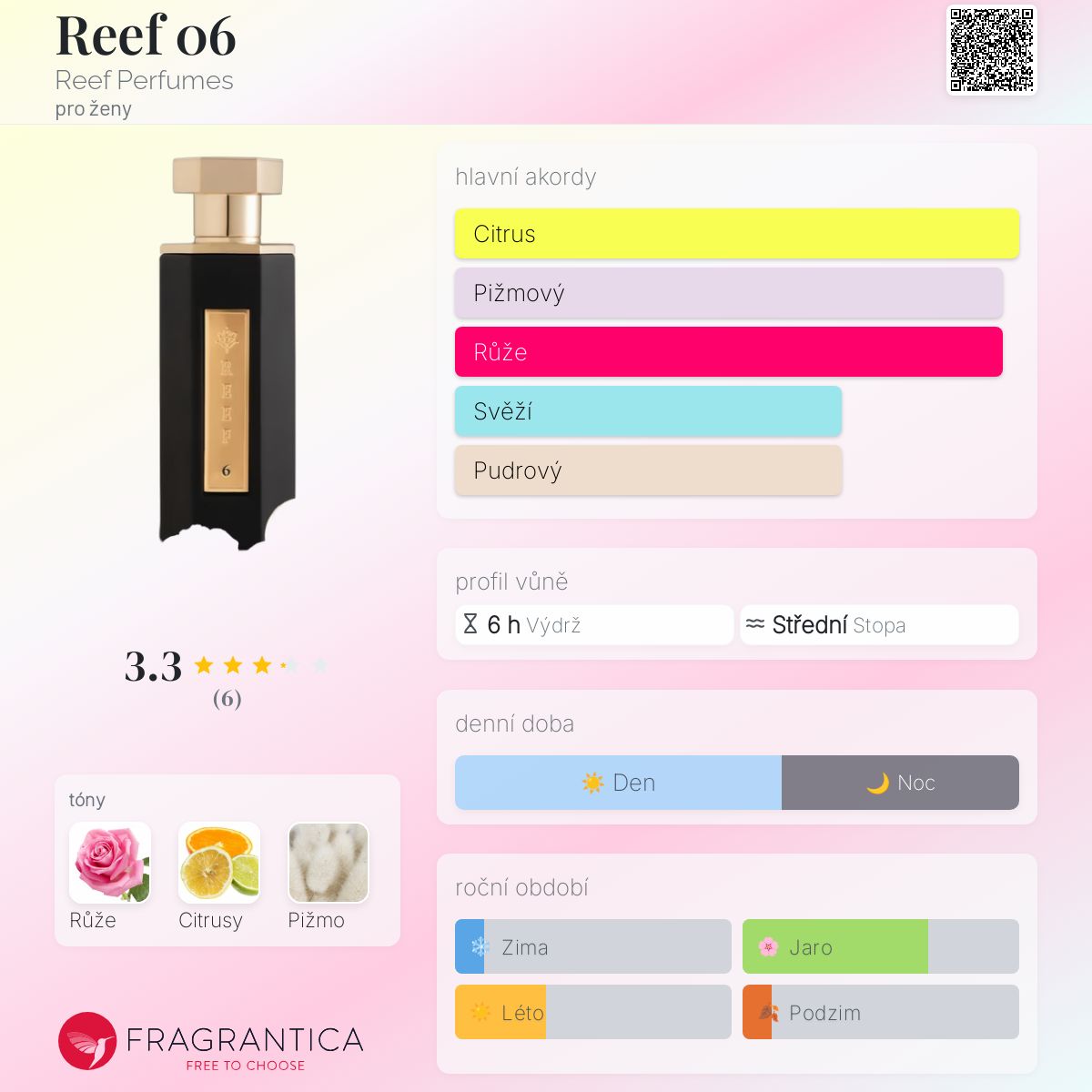 Reef 06 podle Reef Perfumes je Orientální Woody vůně pro ženy. Reef 06 byl/a uveden/a v roce 2024. Vrchní tón je Růže ; střední tón jeCitrusy ; základní tón je Pižmo.