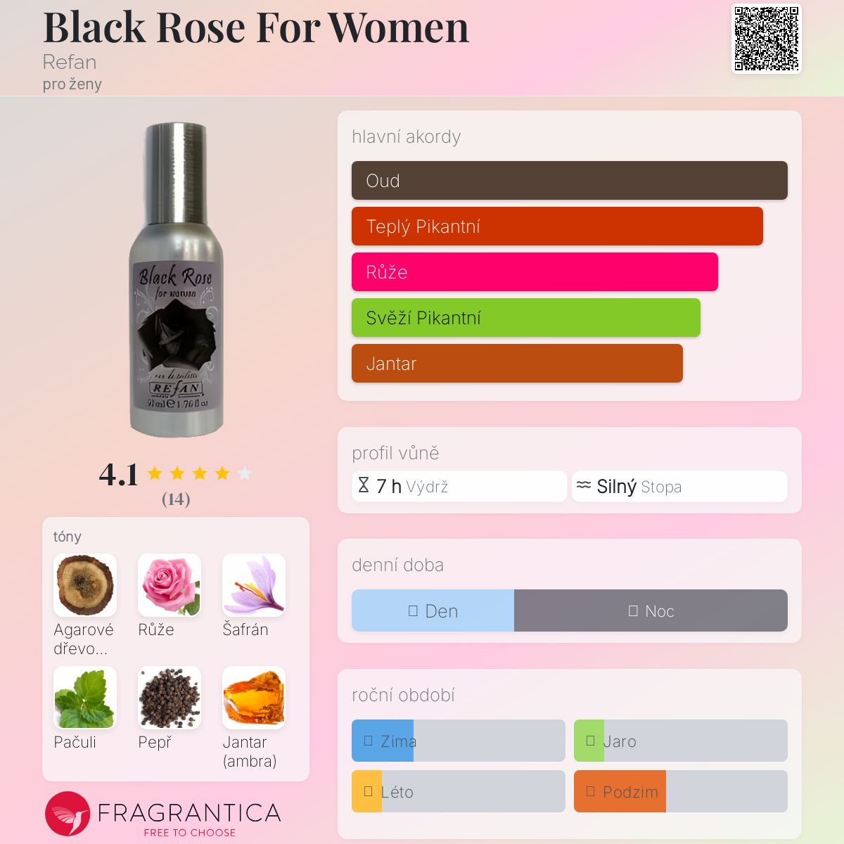 Black Rose For Women podle Refan je Orientální Floral vůně pro ženy. Vrchní tóny jsou Šafrán a Pepř; střední tóny jsouAgarové dřevo (oud), Růže a Jasmín ; základní tóny jsou Pačuli, Jantar (ambra) a Labdanum.