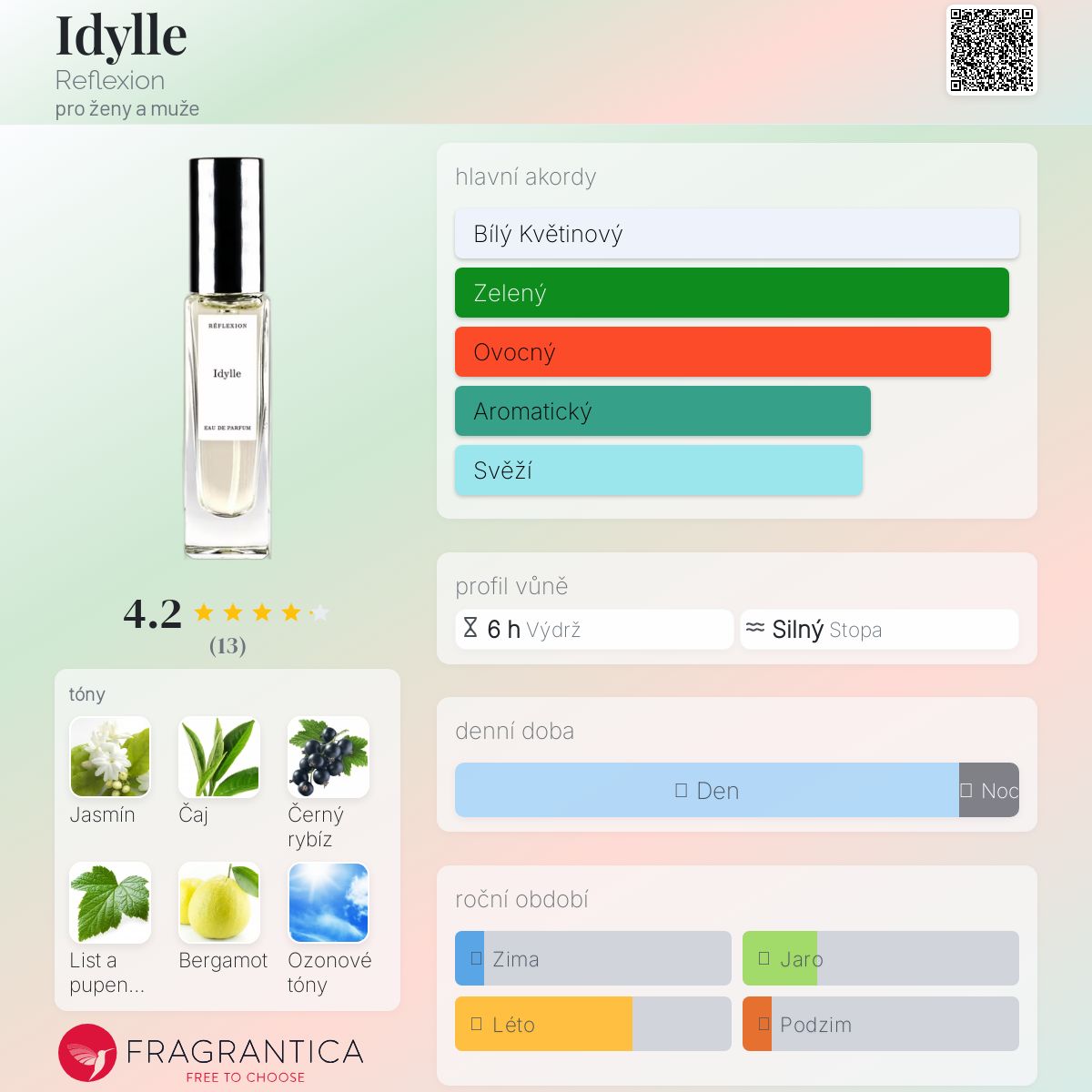 Idylle podle Reflexion je Floral Woody Musk vůně pro ženy a muže. "Nosem" za touto vůní je Eugene Firsanov. Vrchní tóny jsou Jasmín, Černý rybíz a Bergamot; střední tóny jsouČerný čaj, Zelený čaj, Černý rybíz a Růže ; základní tóny jsou Čaj, Ozonové tóny a Dřevité tóny.