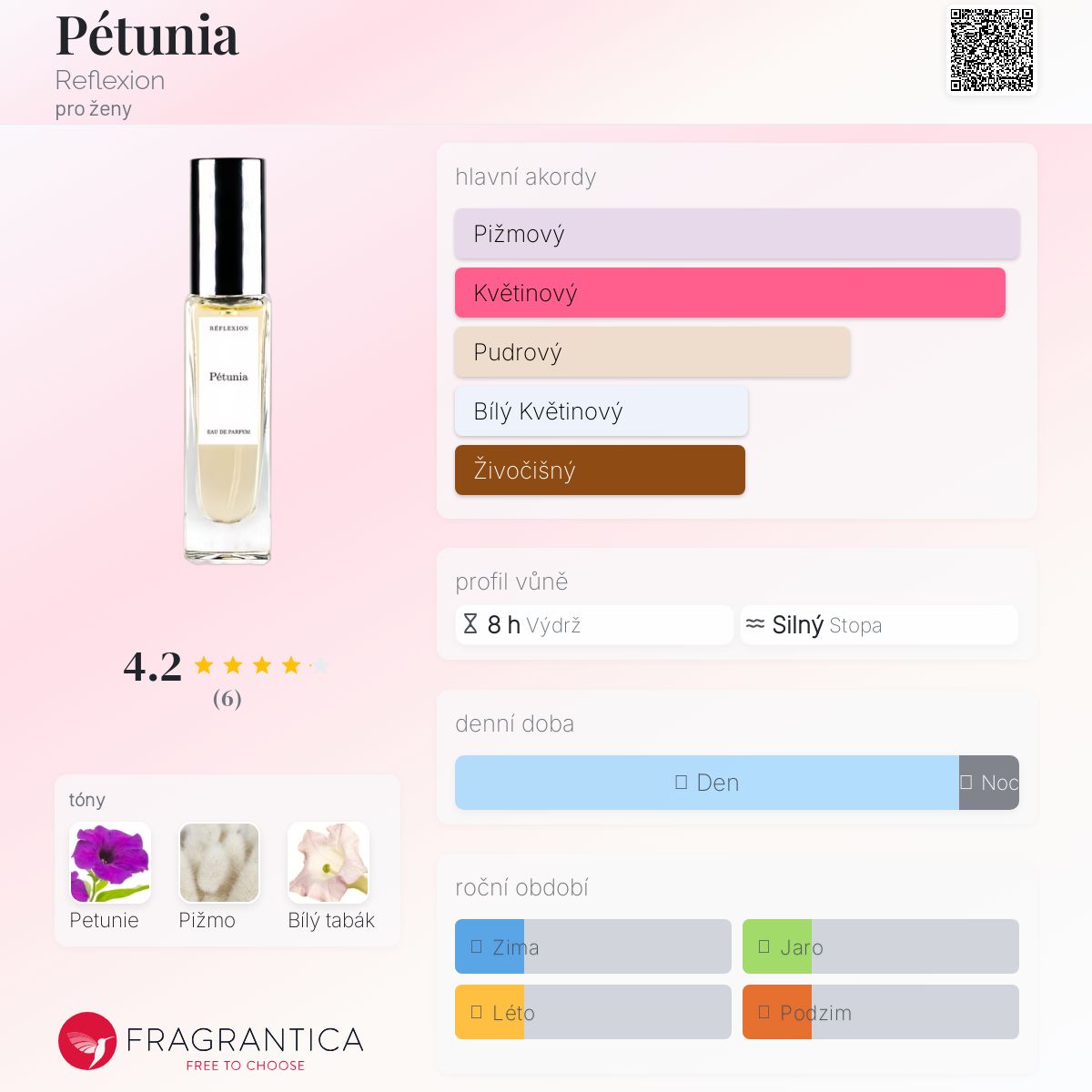 Pétunia podle Reflexion je Floral vůně pro ženy. Pétunia byl/a uveden/a v roce 2021. "Nosem" za touto vůní je Eugene Firsanov.