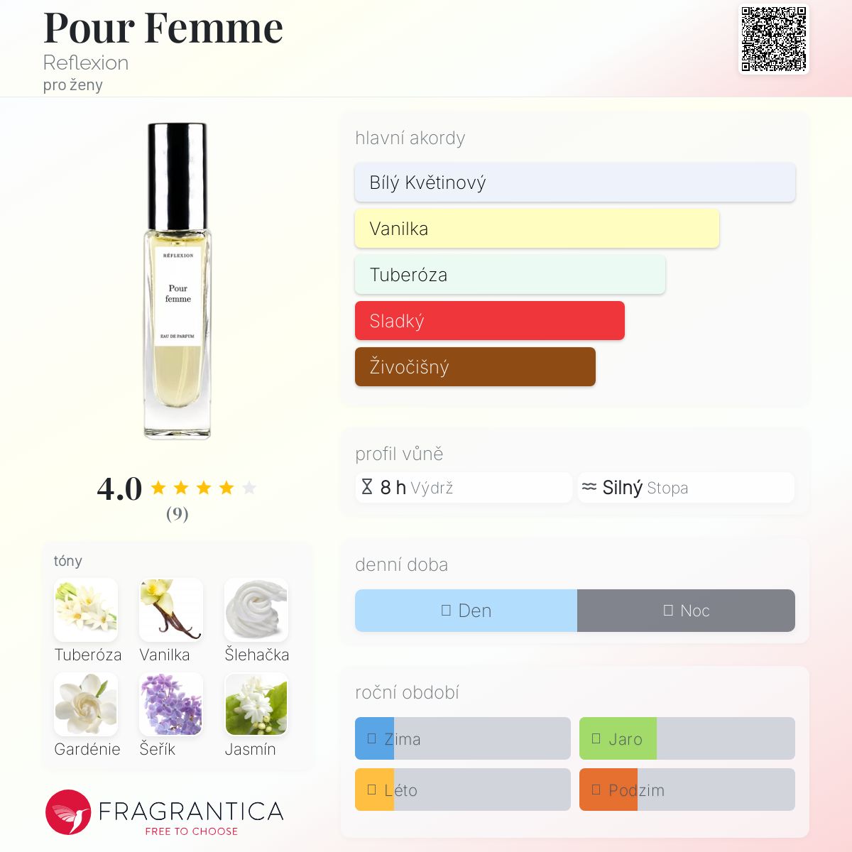 Pour Femme podle Reflexion je Floral vůně pro ženy. "Nosem" za touto vůní je Eugene Firsanov. Vrchní tóny jsou Tuberóza, Gardénie a Šeřík; střední tóny jsouVanilka, Gardénie a Jasmín ; základní tóny jsou Šlehačka, Bílé květy a Pižmo.