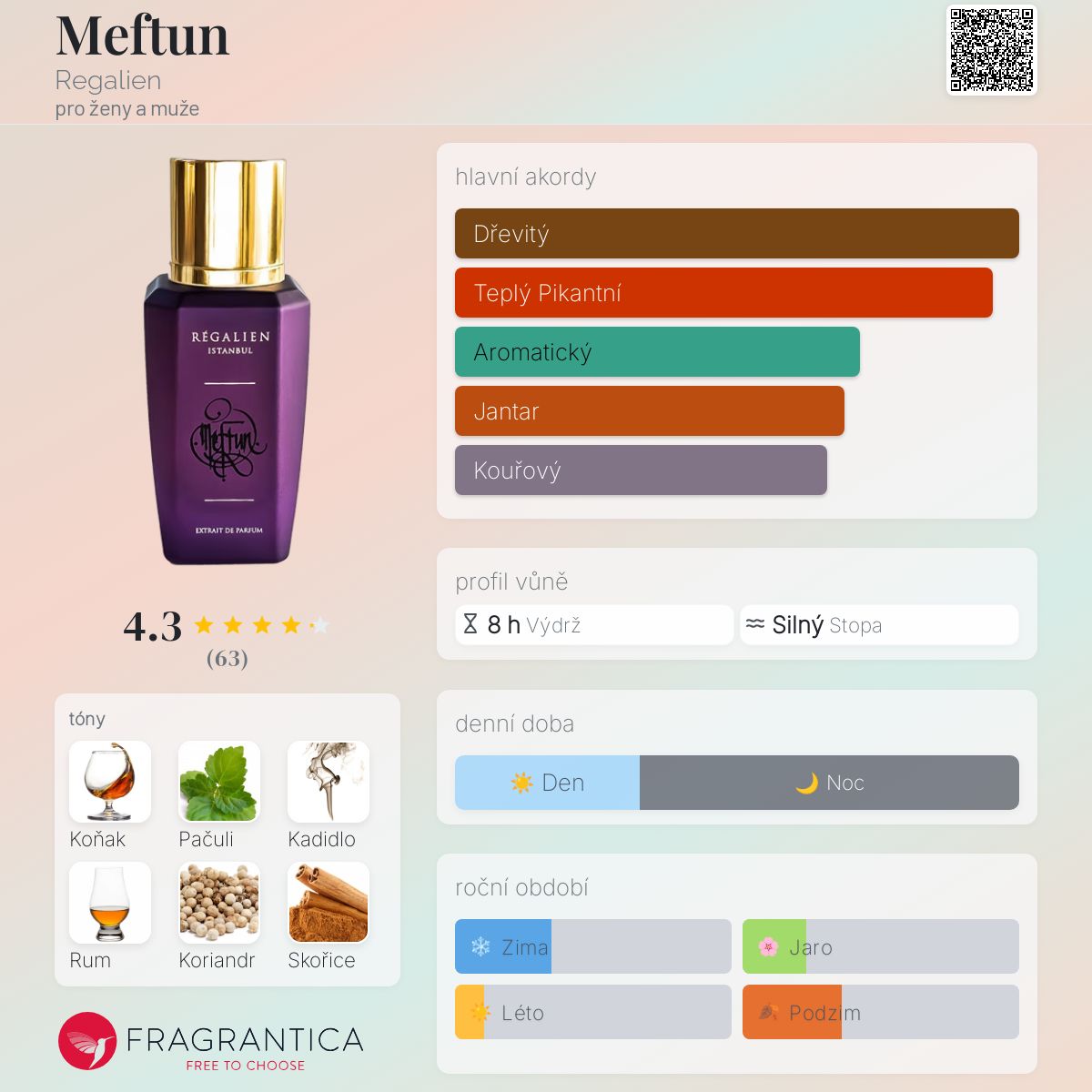 Meftun podle Regalien je Orientální Woody vůně pro ženy a muže. Meftun byl/a uveden/a v roce 2021. "Nosem" za touto vůní je Jorge Lee. Vrchní tóny jsou Koňak, Rum, Koriandr a Skořice; střední tóny jsouPelyněk, Skořice, Červené bobule, Březový list, Andělika a Zázvor ; základní tóny jsou Pačuli, Kadidlo, Ambrette (přírodní pižmo) a Santalové dřevo.