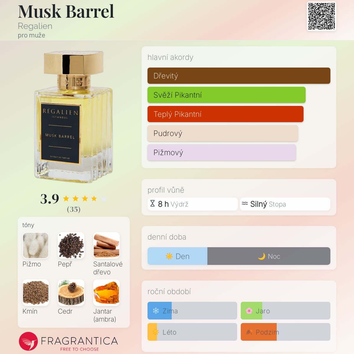 Musk Barrel podle Regalien je Orientální Woody vůně pro muže. Musk Barrel byl/a uveden/a v roce 2018. "Nosem" za touto vůní je Cara Sylvain. Vrchní tóny jsou Černý pepř, Kmín a Šafrán; střední tóny jsouZimolez a Jasmín ; základní tóny jsou Pižmo, Santalové dřevo, Atlasový cedr, Jantar (ambra) a Pačuli.