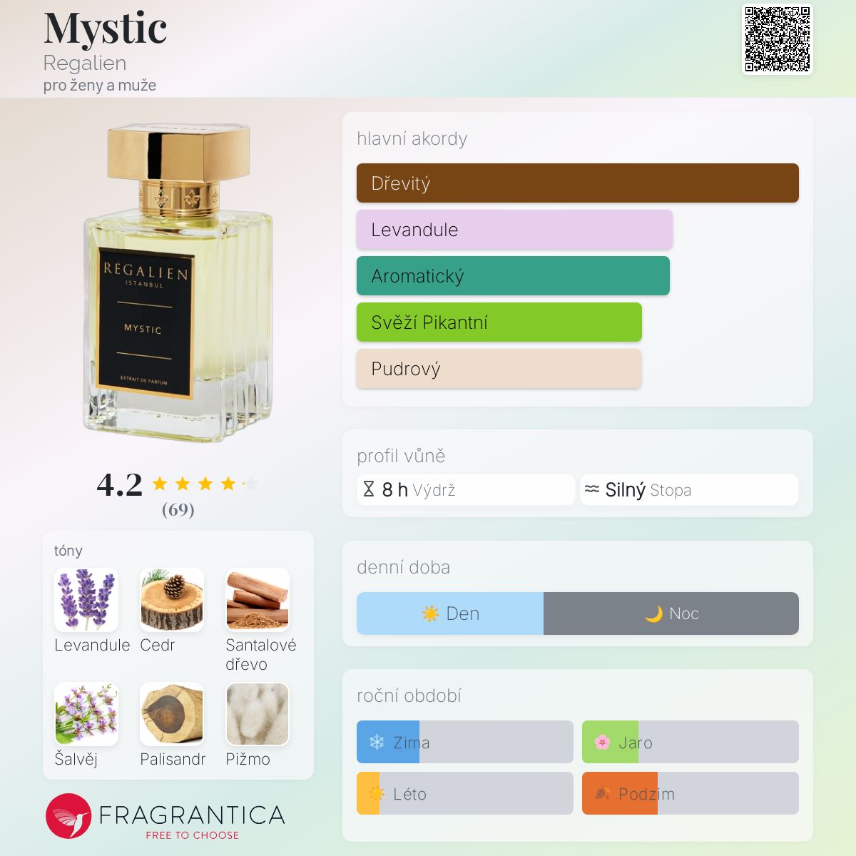 Mystic podle Regalien je Orientální Woody vůně pro ženy a muže. Mystic byl/a uveden/a v roce 2018. Mystic byl/a vytvořen/a MG Gulcicek a Firmenich. Vrchní tóny jsou Cedrové jehly, Šalvěj, Palisandr a Bergamot; střední tóny jsouLevandule a Pepř ; základní tóny jsou Santalové dřevo, Bílé pižmo, Vanilka, Gurjanský balzám, Fazole tonka, Agarové dřevo (oud) a Jantar (ambra).