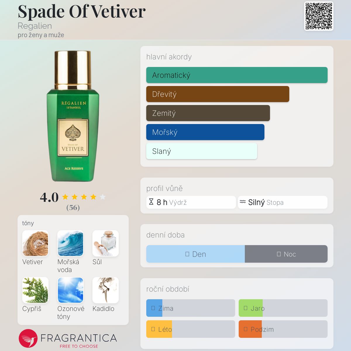Spade Of Vetiver podle Regalien je Aromatic Aquatic vůně pro ženy a muže. Spade Of Vetiver byl/a uveden/a v roce 2019. "Nosem" za touto vůní je Koray Sevinç. Vrchní tóny jsou Mořské tóny, Ozonové tóny, Zemité tóny, Grapefruit a Kardamom; střední tóny jsouSůl, Cypřiš, Šalvěj muškátová a Pelargónie ; základní tóny jsou Haitský vetiver, Java vetiverový olej, Kadidlo, Pačuli a Opoponax.