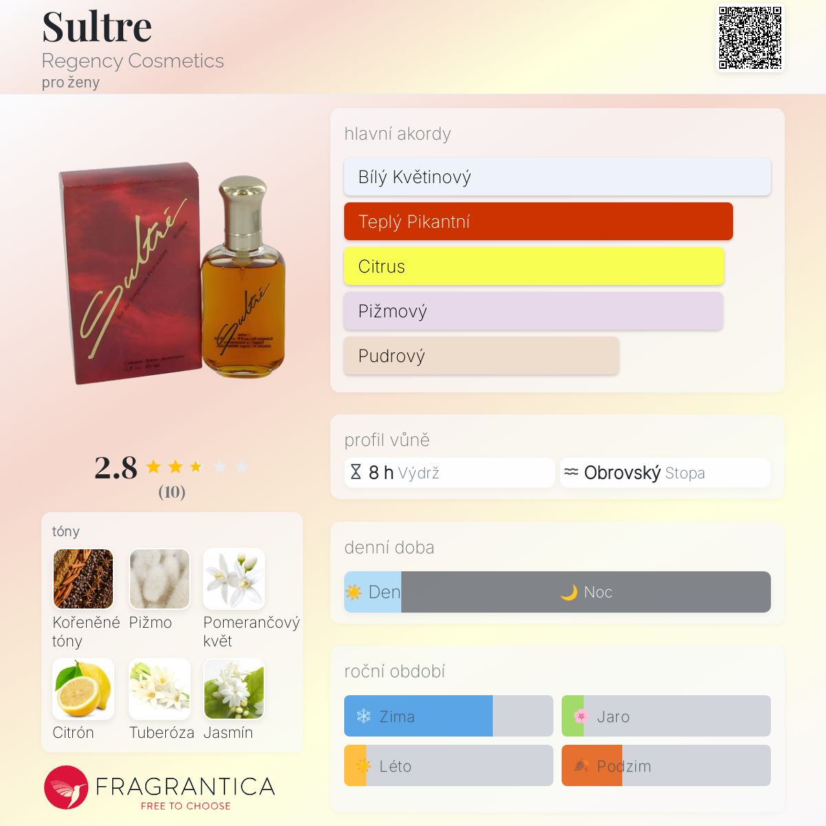 Sultre podle Regency Cosmetics je Floral vůně pro ženy. Sultre byl/a uveden/a v roce 1988.