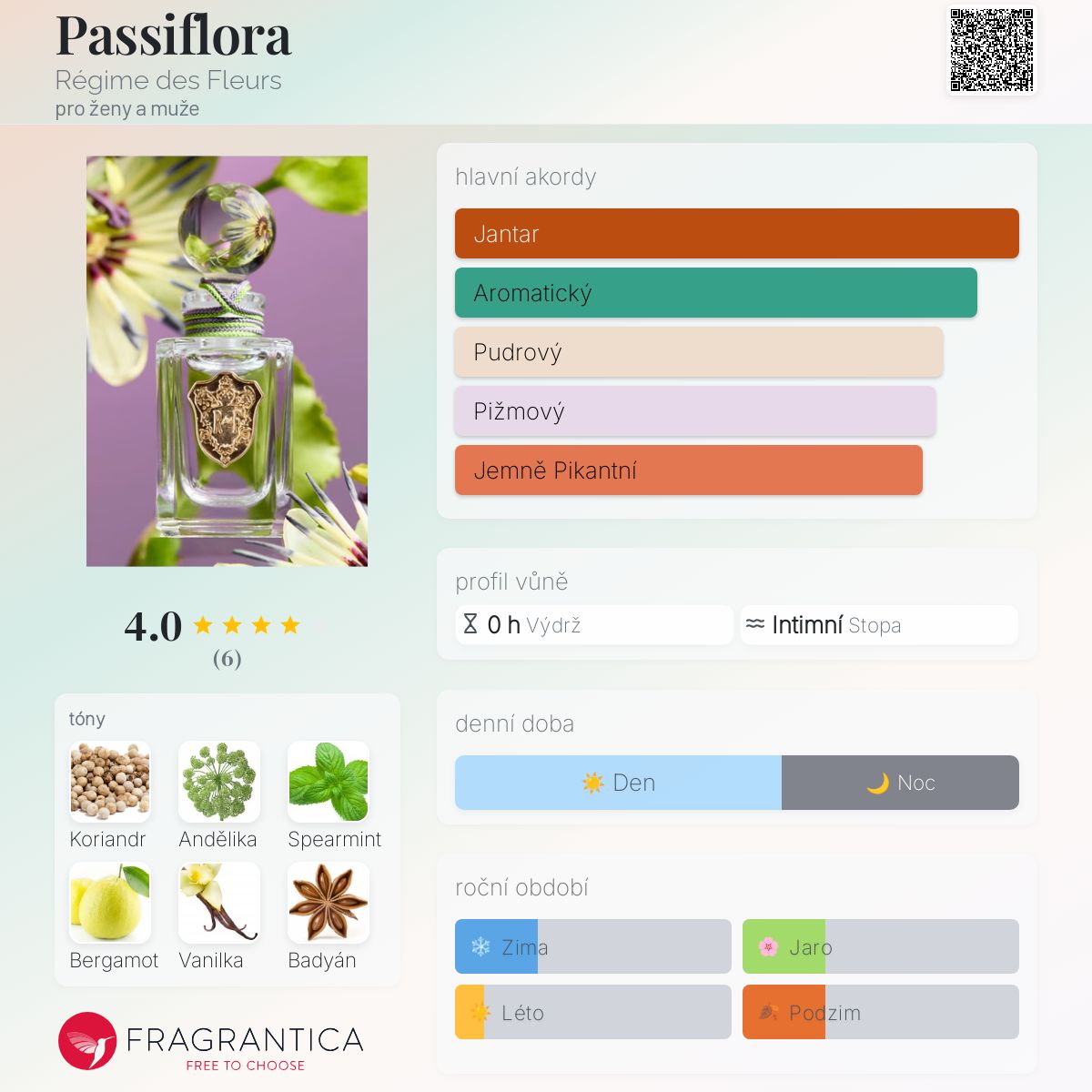 Passiflora podle Régime des Fleurs je Aromatic Fruity vůně pro ženy a muže. Toto je nová vůně. Passiflora byl/a uveden/a v roce 2025. "Nosem" za touto vůní je Alia Raza. Vrchní tóny jsou Spearmint, Bergamot, Badyán a Kardamom; střední tóny jsouKoriandr, Myrha, Mučenka a Olibanum ; základní tóny jsou Andělika, Vanilka, Cypriolový olej a Santalové dřevo.