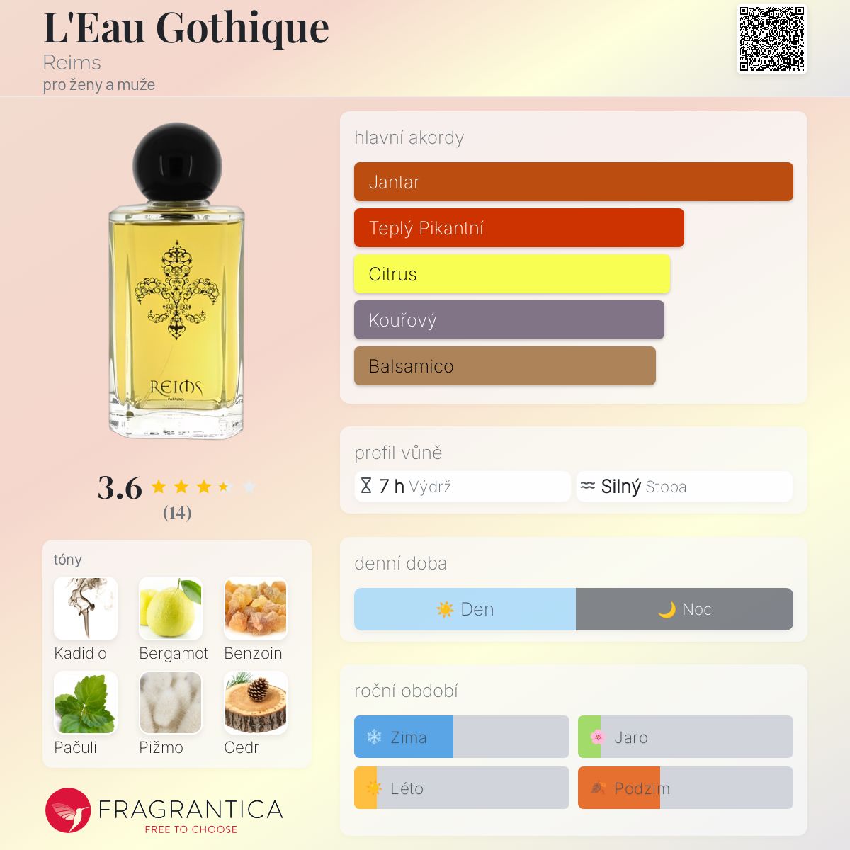 L'Eau Gothique podle Reims je Woody vůně pro ženy a muže. L'Eau Gothique byl/a uveden/a v roce 2016. "Nosem" za touto vůní je Bertrand Duchaufour.