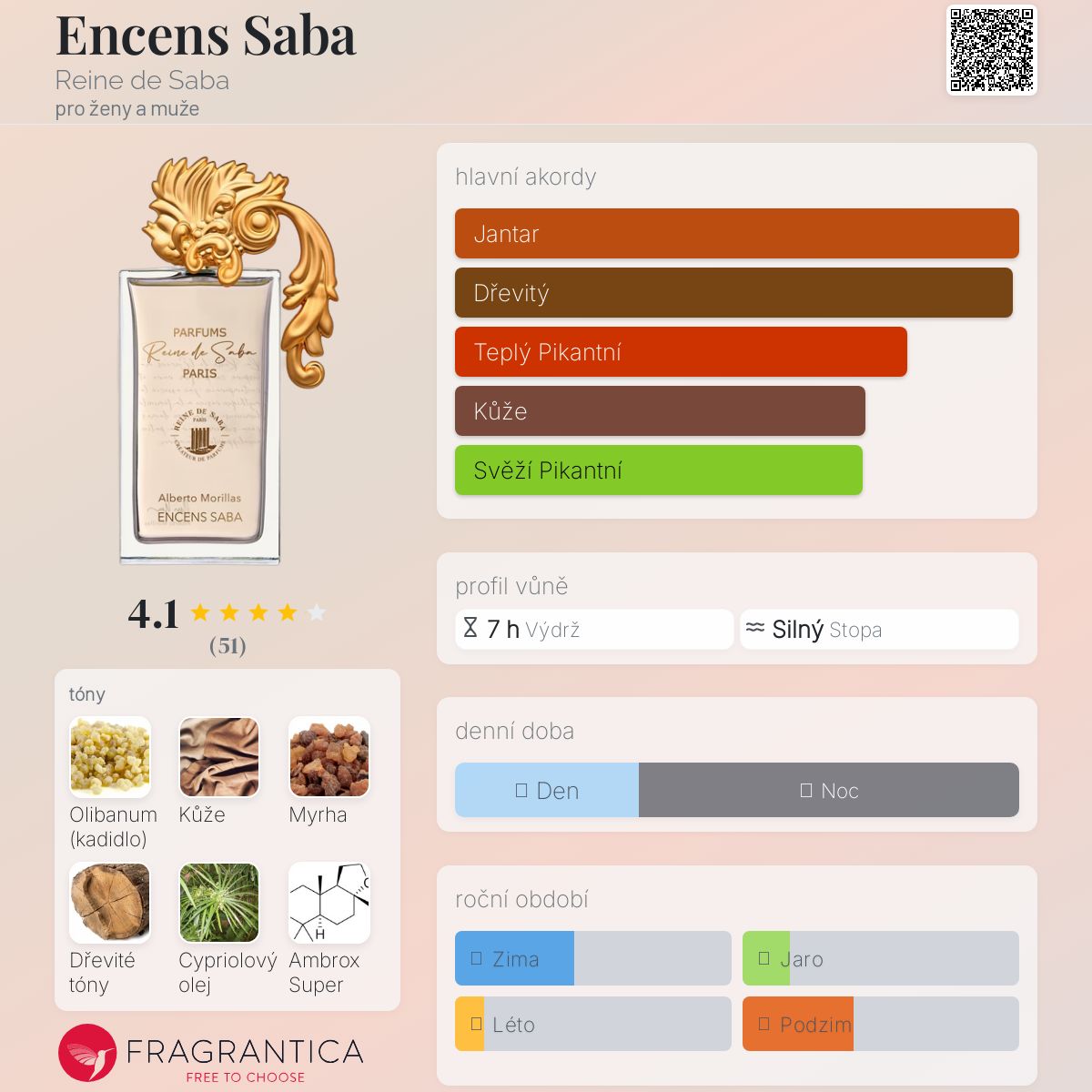 Encens Saba podle Reine de Saba je Orientální Woody vůně pro ženy a muže. Encens Saba byl/a uveden/a v roce 2022. "Nosem" za touto vůní je Alberto Morillas. Vrchní tóny jsou Černý pepř, Skořice a Pomeranč; střední tóny jsouCypriolový olej, Ambrox Super a Damašská růže ; základní tóny jsou Olibanum, Kůže, Myrha, Dřevité tóny, Pačuli a Pižmo.