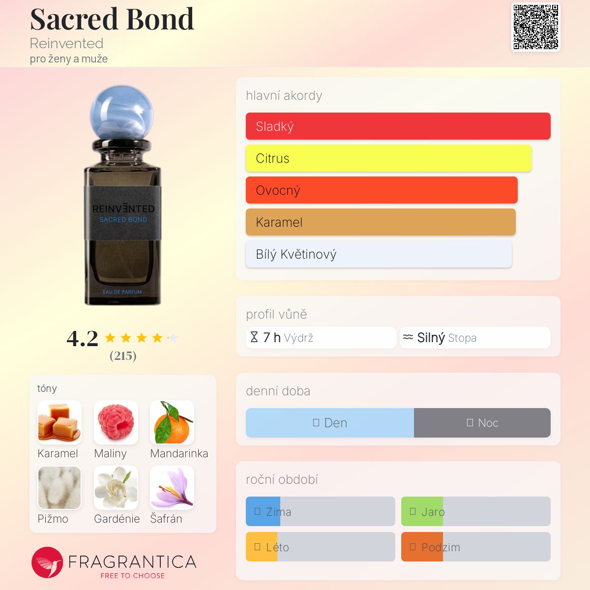 Sacred Bond podle Reinvented je Orientální Floral vůně pro ženy a muže. Sacred Bond byl/a uveden/a v roce 2023. "Nosem" za touto vůní je Hüseyin Erdoğmuş. Vrchní tóny jsou Maliny, Mandarinka a Bergamot; střední tóny jsouGardénie, Jasmín a Růže ; základní tóny jsou Karamel, Bílé pižmo, Šafrán, Benzoin, Vanilka, Jantar (ambra) a Santalové dřevo.